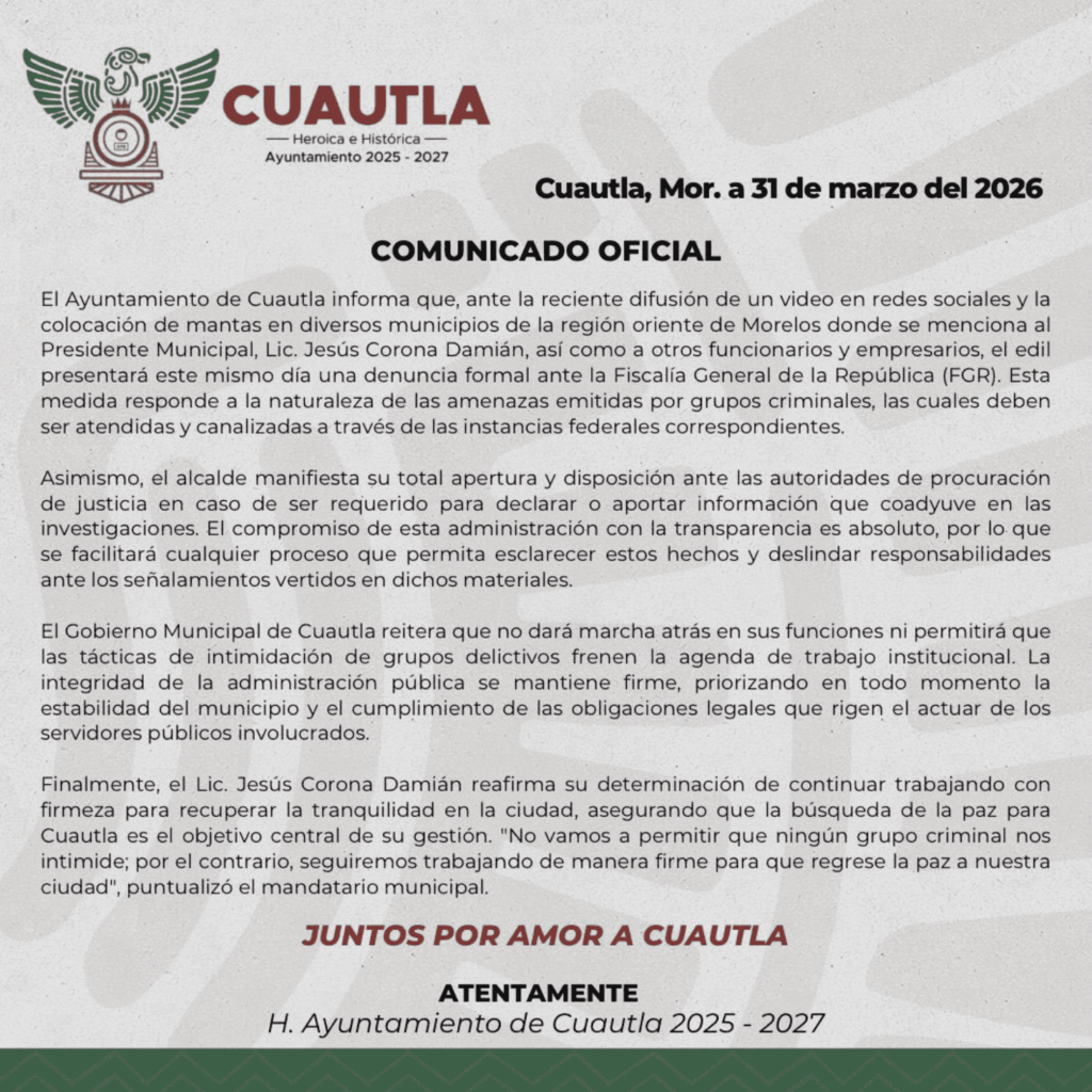 Ante la reciente difusión de videos en redes sociales y la aparición de mantas (narcomantas) en diversos municipios de la zona oriente de Morelos, el Ayuntamiento de Cuautla emitió un comunicado oficial informando que el alcalde, Lic. Jesús Corona Damián, presentará una denuncia formal ante la Fiscalía General de la República (FGR).