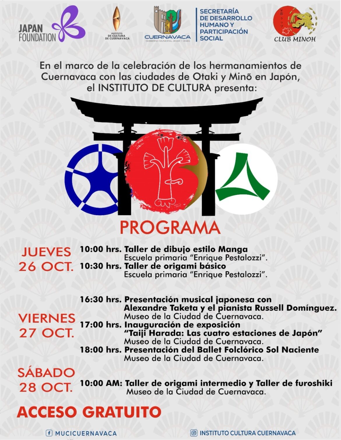 El Ayuntamiento de Cuernavaca, a través del Instituto de Cultura, tiene preparadas una serie de actividades gratuitas para celebrar los lazos de hermanamiento con las ciudades japonesas de Ōtaki y Minō, las cuales se llevarán a cabo del jueves 26 al sábado 28 de octubre en el Museo de la Ciudad de Cuernavaca (MuCIC) y la escuela primaria «Enrique Peztallozi».