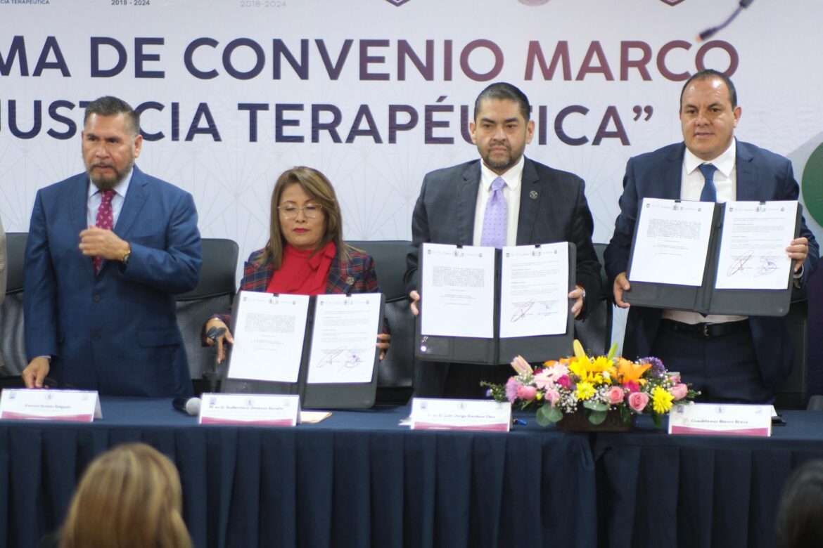 Así lo destacó el Magistrado Presidente del H. TSJ, Luis Jorge Gamboa Olea, durante la firma del convenio marco de colaboración en Justicia Terapéutica impulsado por la Magistrada Guillermina Jiménez Serafín, Coordinadora del Tribunal de Justicia Terapéutica, y el cual fue signado este día por el gobernador, Cuauhtémoc Blanco Bravo como testigo de honor.