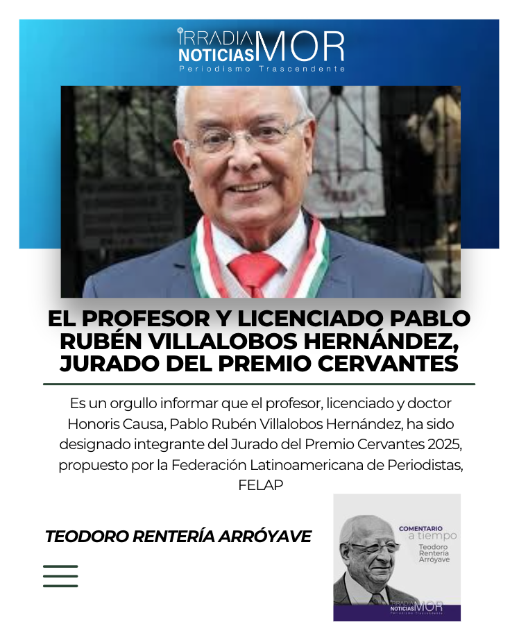 Es un orgullo informar que el profesor, licenciado y doctor Honoris Causa, Pablo Rubén Villalobos Hernández, ha sido designado integrante del Jurado del Premio Cervantes 2025, propuesto por la Federación Latinoamericana de Periodistas, FELAP, nuestra organización continental que tiene un asiento permanente en ese Premio, el más prestigiado, reconocido y por ende más codiciado del mundo en letra castellana.