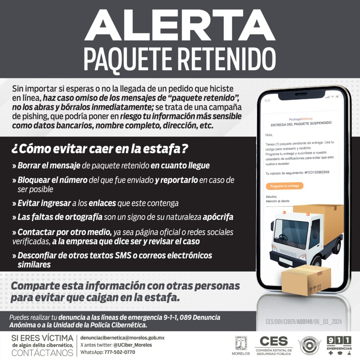 El Gobierno de Morelos, a través de la Comisión Estatal de Seguridad Pública (CES), dio a conocer una serie de recomendaciones a la población para prevenir diversos delitos relacionados a servicios de paquetería, así como diferentes tipos de extorsión telefónica.