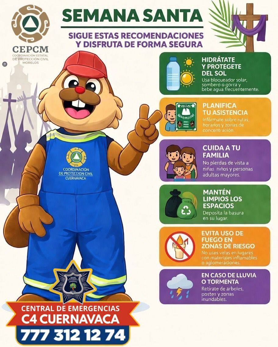 En el marco del periodo vacacional de Semana Santa 2026, el Ayuntamiento de Cuernavaca, a través de la Coordinación de Protección Civil, hace un llamado a la ciudadanía para fortalecer las medidas de autocuidado y prevención, con el propósito de proteger la integridad de las familias que participan en actividades religiosas, recreativas y turísticas.