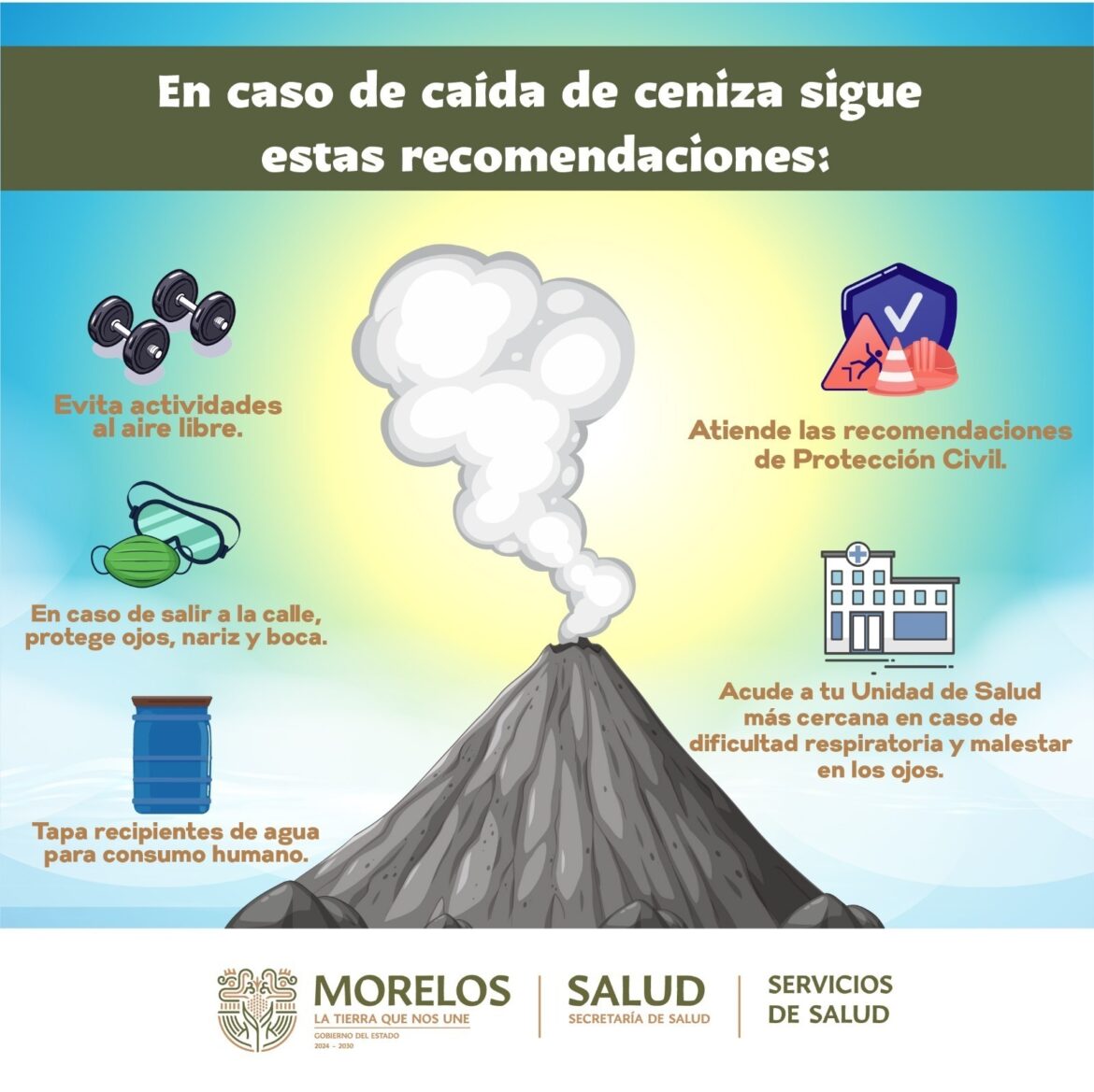 La administración que encabeza la gobernadora Margarita González Saravia, pidió a la población seguir las recomendaciones que emite la Secretaría de Salud, a través de Servicios de Salud de Morelos (SSM), ante la caída de ceniza volcánica.