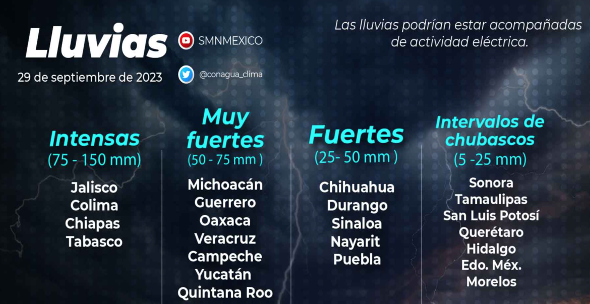 Para este sábado se pronostican lluvias puntuales intensas (de 75 a 150 milímetros [mm]) en regiones de Campeche, Chiapas, Tabasco y Yucatán; muy fuertes (de 50 a 75 mm) en zonas de Quintana Roo y Veracruz; fuertes (de 25 a 50 mm) en áreas de Colima, Guerrero, Jalisco, Michoacán, Nayarit y Oaxaca; intervalos de chubascos (de 5 a 25 mm) en Chihuahua, Ciudad de México, Coahuila, Durango, Estado de México, Morelos, Nuevo León, Puebla, San Luis Potosí, Sinaloa y Tamaulipas, así como lluvias aisladas (de 0.1 a 5 mm) en Baja California, Hidalgo, Querétaro, Sonora, Tlaxcala y Zacatecas.