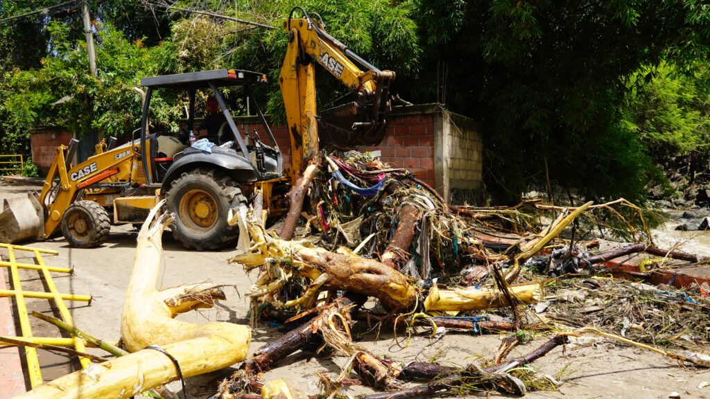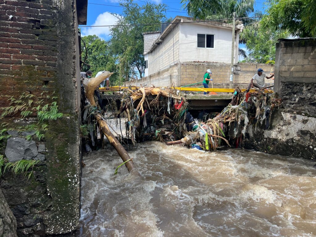 Con apoyo de maquinaria pesada, autoridades del Ayuntamiento de Emiliano Zapata continúan con el retiro de escombros y material arrastrado por las corrientes de agua.