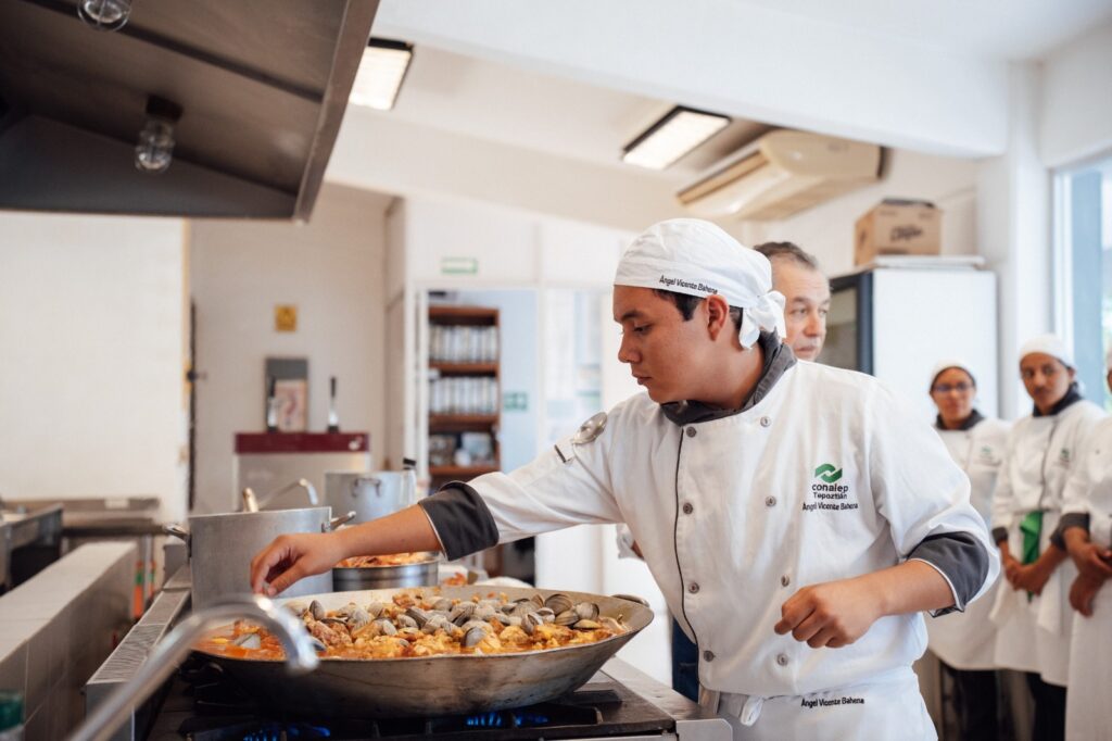 Con motivo de las actividades programadas en este cierre de ciclo escolar, el Colegio Nacional de Educación Profesional Técnica (Conalep) Morelos, plantel Tepoztlán, realizó una clase demostrativa denominada “Paella y Arroz morelense con denominación de origen”, en la cual participaron alumnas y alumnos de la carrera de alimentos y bebidas.