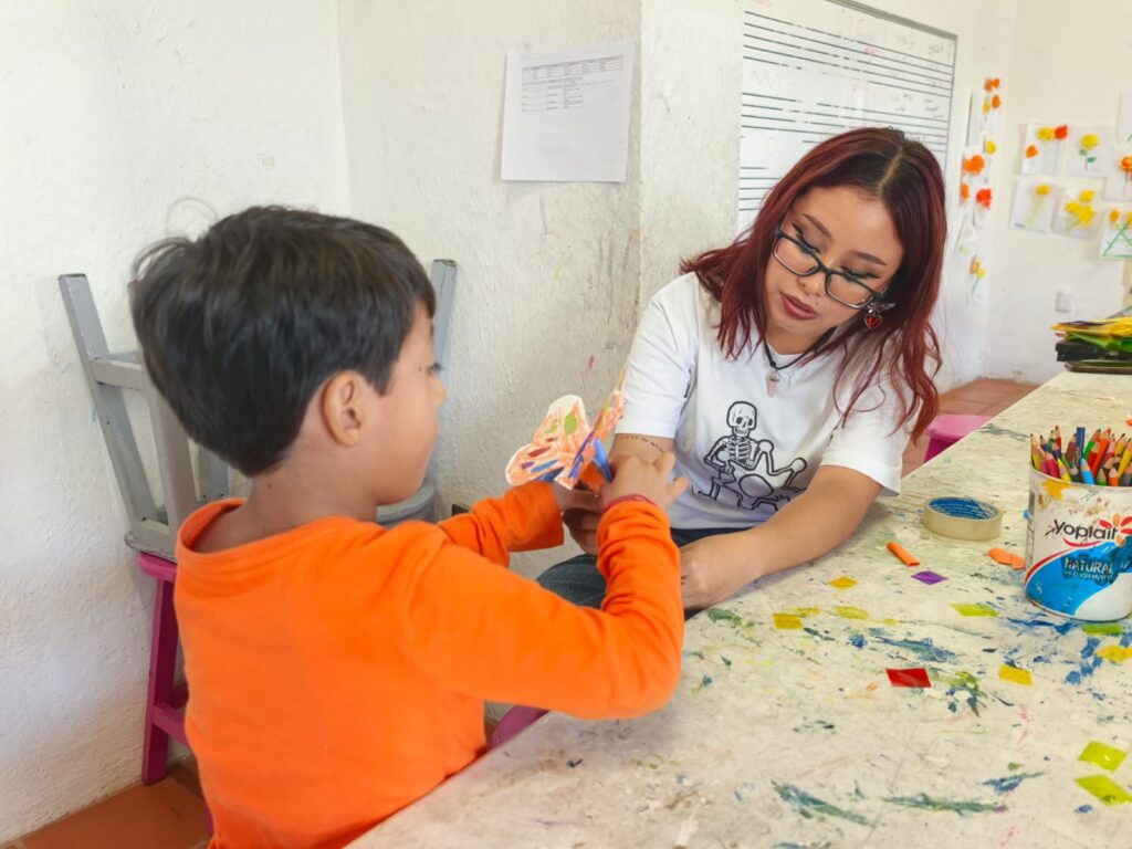 En las actividades desarrolladas en la Feria de las Calacas, niñas y niños crearon piezas de papel picado, reflexionaron sobre la importancia de las ofrendas y dialogaron sobre la memoria familiar como un puente entre generaciones. Cada taller buscó promover el vínculo entre tradición, creatividad y comunidad, reafirmando el papel del arte como herramienta educativa y emocional.