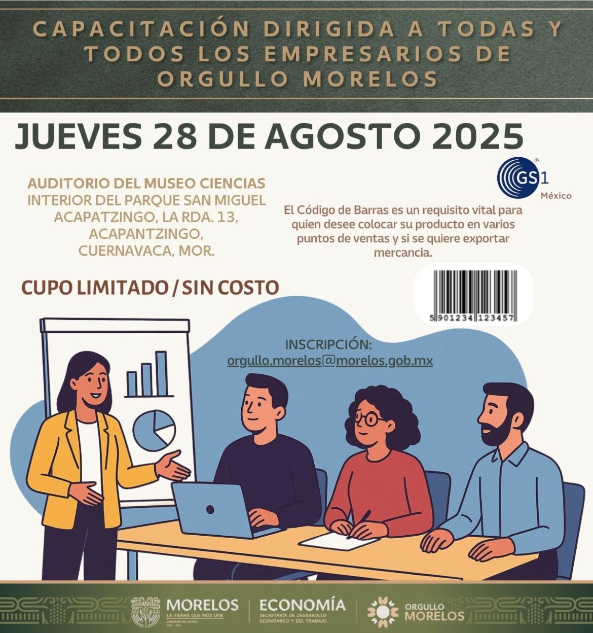 El Gobierno del Estado de Morelos, a través de la Secretaría de Desarrollo Económico y del Trabajo (SDEyT), anunció una capacitación especializada dirigida a empresarias y empresarios que integran el programa “Orgullo Morelos”, la cual, se llevará a cabo el próximo jueves 28 de agosto de 2025, en el auditorio del Museo de Ciencias, ubicado al interior del Parque San Miguel Acapantzingo, en Cuernavaca a las 11:00 horas.