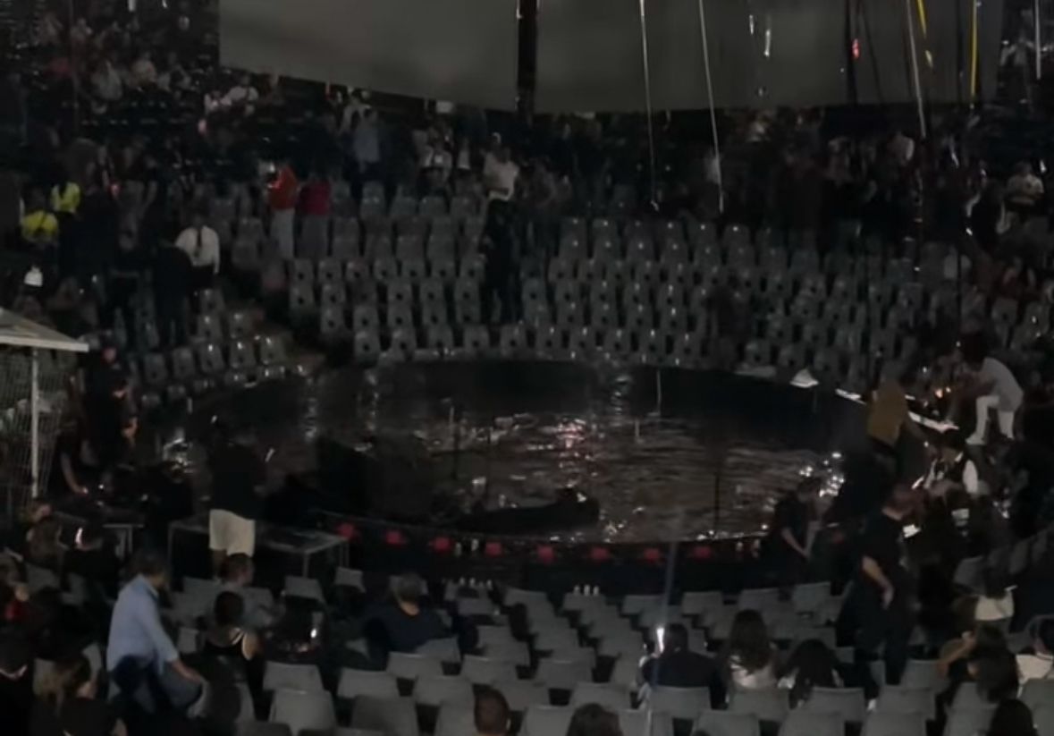 El concierto se encontraba en pleno desarrollo cuando la lluvia subió de intensidad provocando que desde el área de gradas y sobre las escaleras se formaran arroyos que en poco tiempo inundaron el escenario del antiguo palenque; los equipos en poco tiempo quedaron en una zona encharcada.