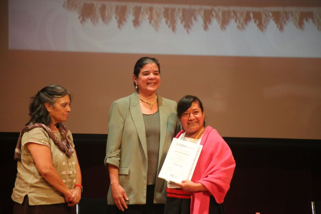 La pieza galardonada destaca por el uso de técnicas ancestrales de tejido en telar de cintura, la aplicación de tintes naturales y la riqueza simbólica que expresa el conocimiento textil de la comunidad de Hueyapan, legado vivo del patrimonio cultural de “La tierra que nos une”.