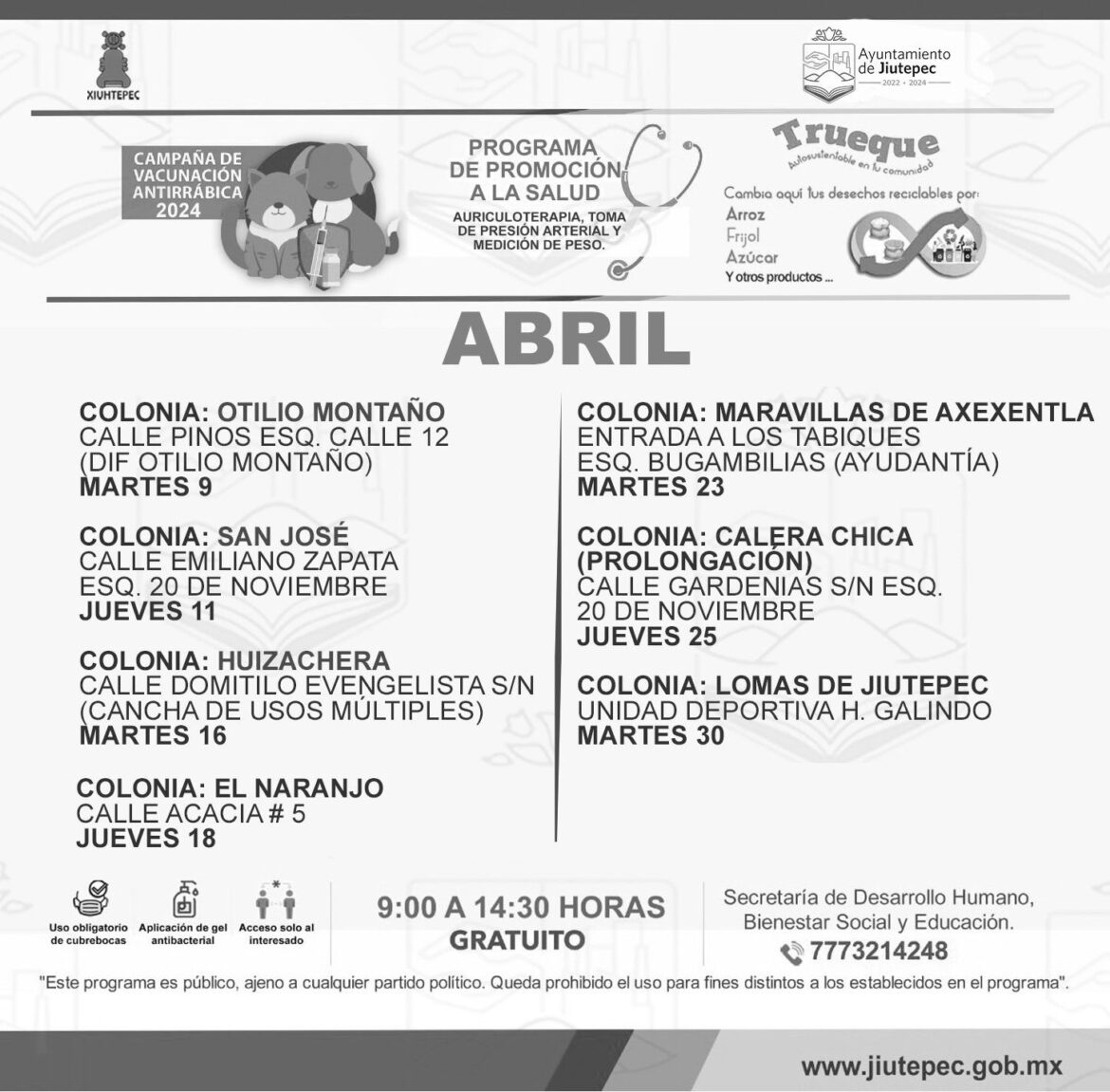 Durante el mes de abril los programas estarán operando de las 9:00 a las 14:30 horas en las colonias: Otilio Montaño el martes nueve, San José el jueves 11, Huizachera el martes 16, El Naranjo el jueves 18, Maravillas de Axexentla el martes 23, Calera Chica el jueves 25 y Lomas de Jiutepec el martes 30.