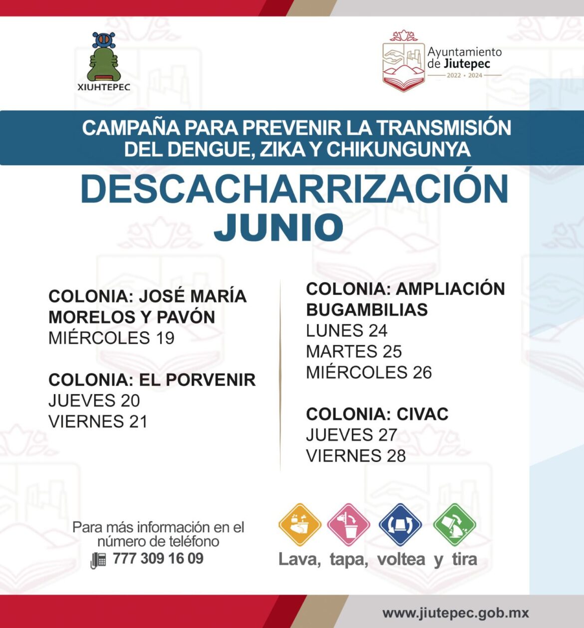 Las jornadas de descacharrizacióm tendrán lugar el miércoles 19 de junio en la colonia José Maria Morelos y Pavón, el jueves 20 y viernes 21 en la colonia El Porvenir, del lunes 24 al miércoles 26 de junio en la colonia Ampliación Bugambilias, así como el jueves 27 y viernes 28 en la colonia Civac.
