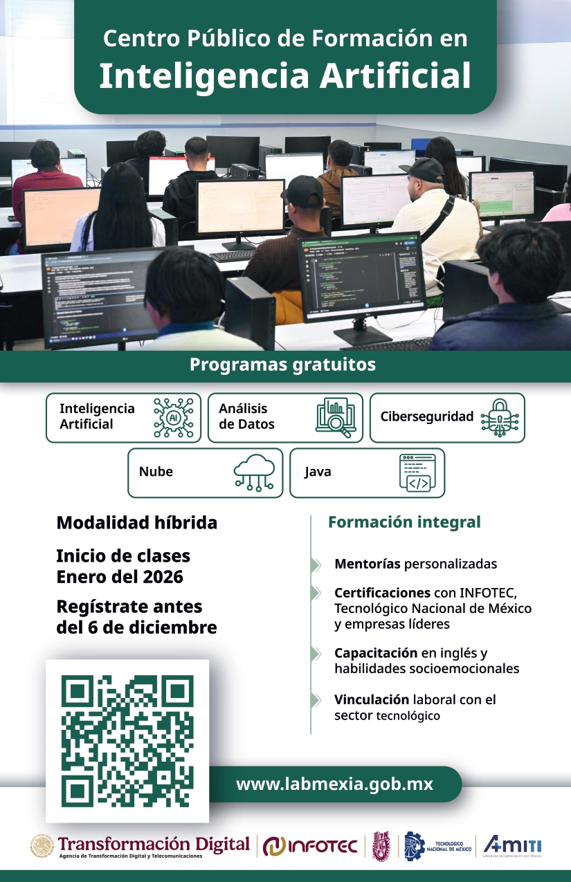 La Agencia de Transformación Digital del estado de Morelos (ATDEM) convoca a la población mayor de dieciocho años a inscribirse en la convocatoria nacional de doble certificación gratuita en Inteligencia Artificial, emitida por el Centro de Investigación e Innovación en Tecnologías de la Información y Comunicación (Infotec), organismo público de investigación del Gobierno de México.