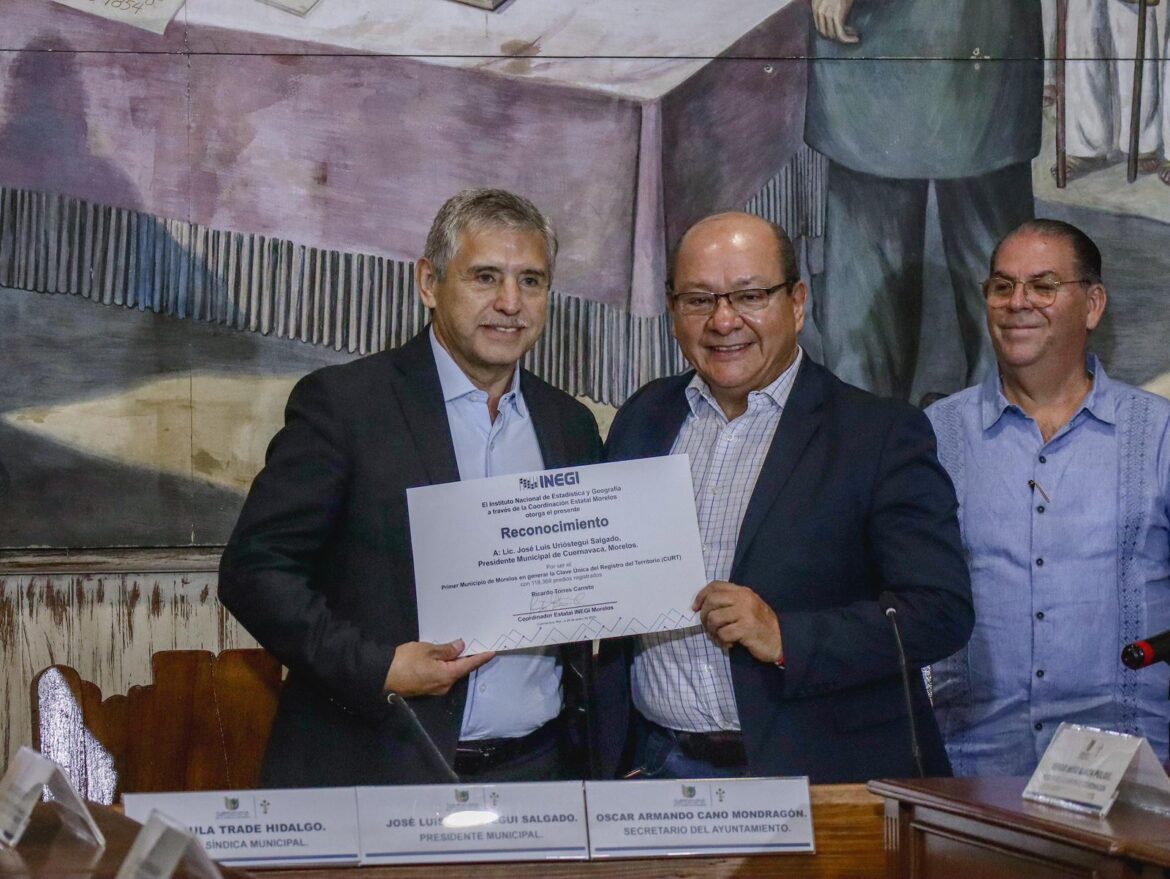 La ciudad de Cuernavaca encabezada por el presidente municipal, José Luis Urióstegui Salgado, recibió este miércoles un importante reconocimiento por parte del Instituto Nacional de Estadística y Geografía (Inegi) que destaca a la ciudad como el primer municipio en el estado de Morelos en obtener la Clave Única de Registro del Territorio (CURT), una herramienta clave para la gestión territorial.