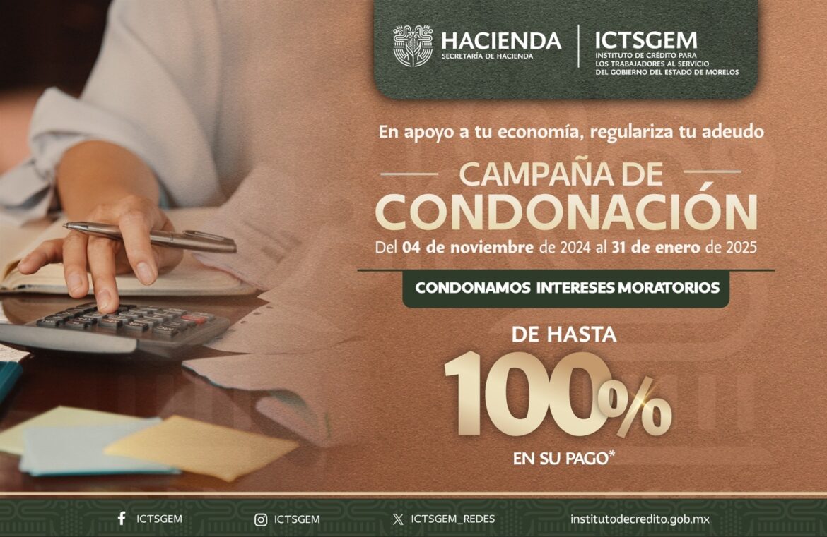 El Gobierno de Morelos, a través del Instituto de Crédito para los Trabajadores al Servicio del Gobierno del Estado de Morelos (ICTSGEM), inicia la Campaña de Condonación de Intereses Moratorios, probada por el Consejo Directivo que preside la gobernadora Margarita González Saravia, la cual tendrá vigencia del 04 de noviembre del 2024 al 31 de enero de 2025.