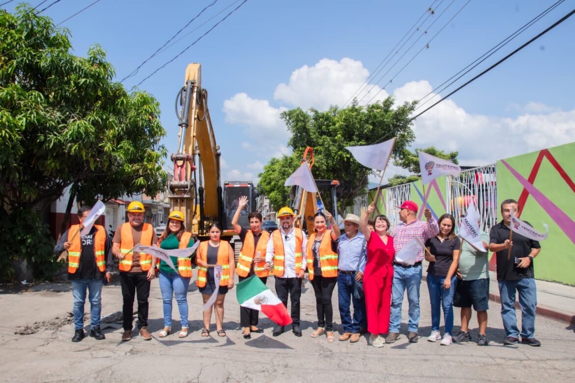El presidente municipal de Yautepec Eder Alonso Gutiérrez, acompañado de miembros del Cabildo y del diputado federal Agustín Alonso, en el banderazo para iniciar formalmente los trabajos de pavimentación e introducción de nueva tubería de agua potable para mejorar el servicio, en la calle Reforma, en la colonia Benito Juárez.