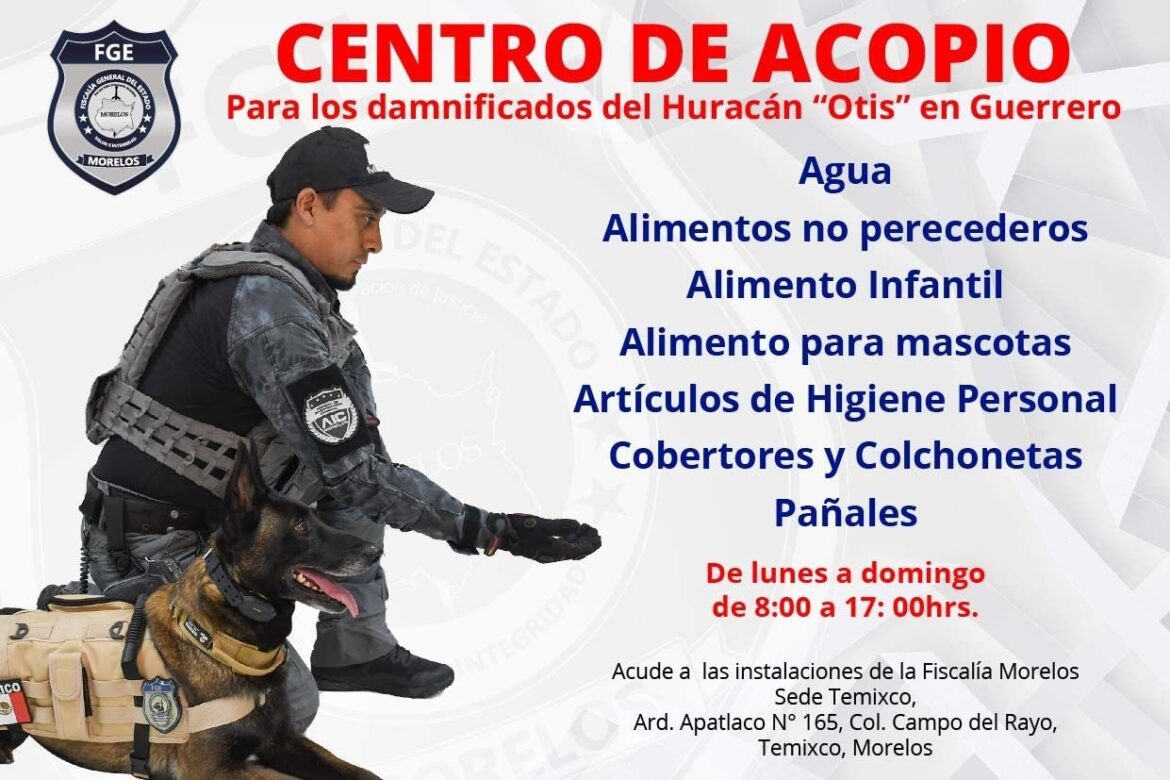 La Fiscalía General del Estado de Morelos instala en sus instalaciones centrales un Centro de Acopio para las y los damnificados del Huracán “Otis” en el estado de Guerrero.