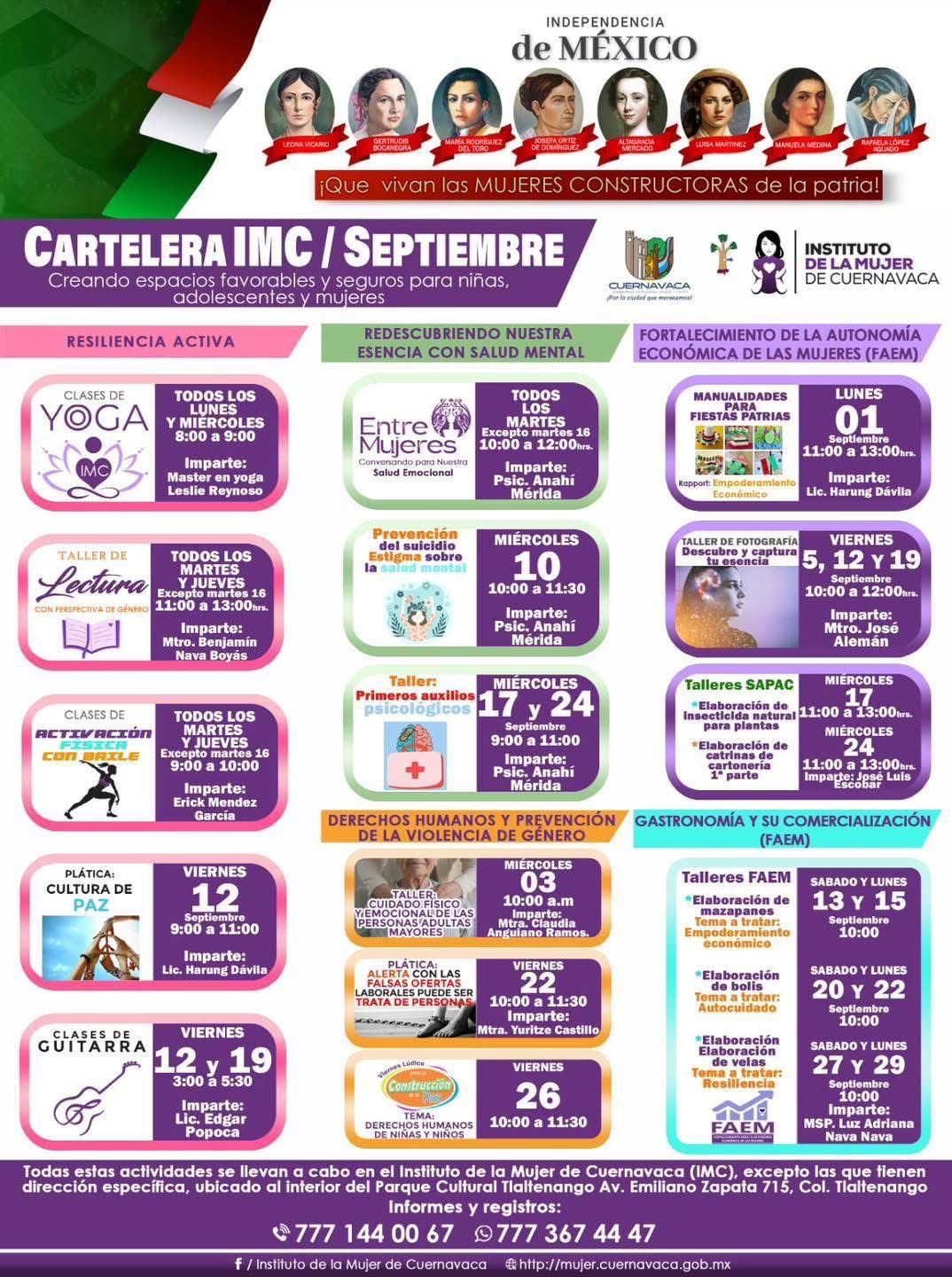 Al grito de «¡Qué vivan las mujeres constructoras de la Patria!”, el Instituto de la Mujer de Cuernavaca (IMC) dio a conocer su Cartelera de Septiembre, una agenda de actividades enfocadas en el desarrollo integral de niñas, adolescentes y mujeres del municipio, a través de cinco programas fundamentales: Resiliencia Activa, Redescubriendo nuestra esencia con salud mental, Fortalecimiento de la Autonomía Económica de las Mujeres (FAEM) y Gastronomía y su comercialización.