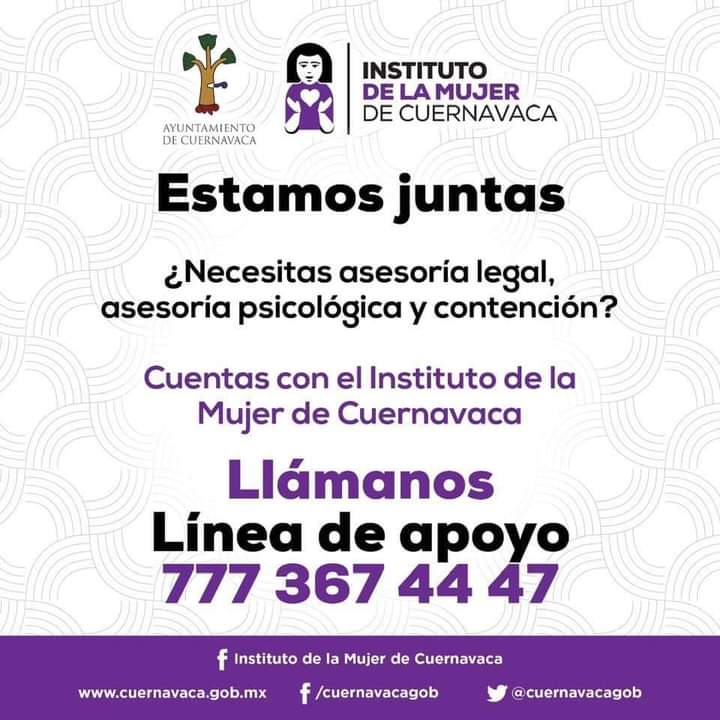 Si vives alguna situación de violencia, el Instituto de la Mujer de Cuernavaca ofrece orientación, atención psicológica y asesoría jurídica a mujeres que lo requieran. Las interesadas pueden acudir a sus instalaciones en Av. Emiliano Zapata 715, Col. Tlaltenango (al interior del Parque Tlaltenango) o bien comunicarse al teléfono 777 144 0067, o visitar el sitio web mujer.cuernavaca.gob.mx