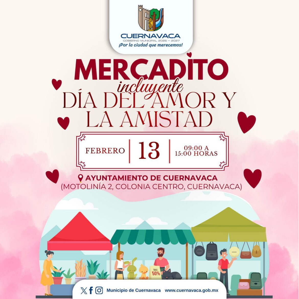 El Ayuntamiento de Cuernavaca, a través de la Secretaría de Desarrollo Humano y Participación Social (SDHyPS), invita a la ciudadanía a asistir al Mercadito Incluyente con motivo del Día del Amor y la Amistad, organizado por la Dirección de Atención a Grupos en Vulnerabilidad y Personas con Discapacidad, como un espacio diseñado para fomentar la convivencia, la inclusión social y el fortalecimiento de la economía local, en un ambiente familiar y solidario.
