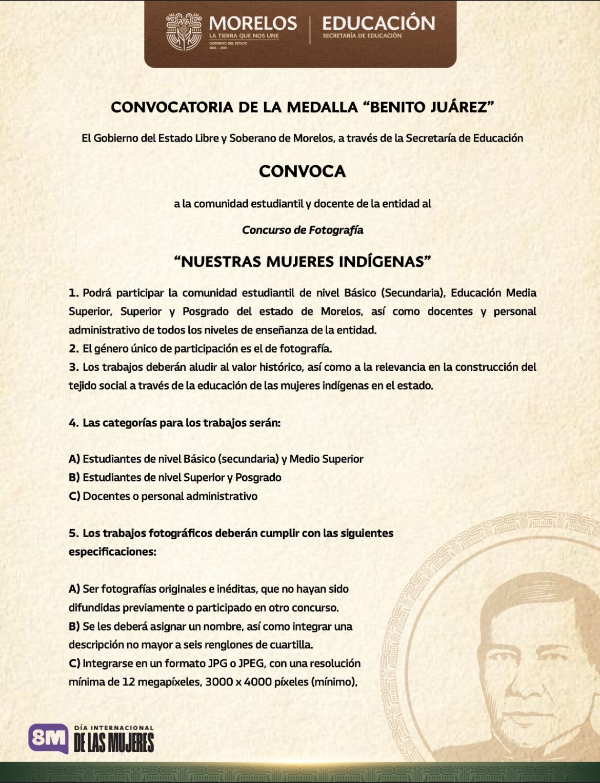 En el marco del Día Internacional de la Mujer, que se conmemora cada 08 de marzo, el Gobierno del Estado de Morelos, a través de la Secretaría de Educación, emitió la convocatoria para el Concurso de Fotografía “Nuestras Mujeres Indígenas”, un espacio que busca visibilizar y resaltar el papel fundamental de las mujeres indígenas en la preservación y fortalecimiento de la historia, tradición y cultura de la entidad.