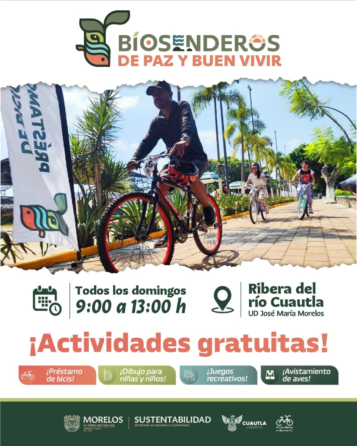 El Gobierno del Estado de Morelos, a través de la Secretaría de Desarrollo Sustentable (SDS), invita a todas las familias a disfrutar de una jornada llena de actividades recreativas, ambientales y culturales con los Biosenderos de Paz y Buen Vivir, que se llevarán a cabo este domingo en la ribera del río Cuautla, de 9:00 a 13:00 horas.