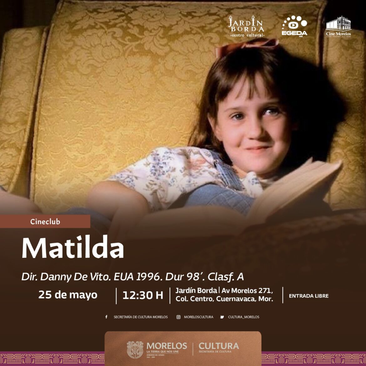 La Secretaría de Cultura del Estado de Morelos, a través de la Dirección General de Museos y Exposiciones, anunció una actividad especial en el marco de la exposición “Ellas frente a una página”, de la artista Amira Aranda. El emblemático Centro Cultural Jardín Borda será sede de la proyección gratuita de la película Matilda (1996), una obra clásica del cine familiar que celebra la inteligencia, imaginación y la fuerza lectora de las niñas.