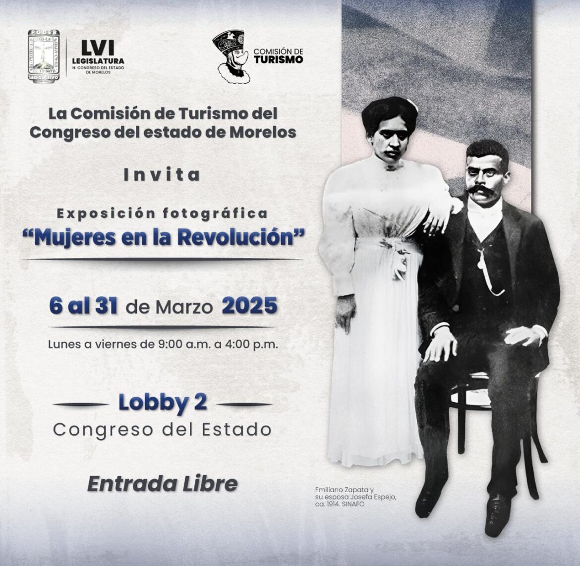 En el marco de la conmemoración del Día Internacional de la Mujer, el presidente de la Comisión de Turismo, Francisco Erik Sánchez Zavala, invitó a la población en general a recorrer la Exposición fotográfica “Mujeres en la Revolución”, que se encuentra instalada en el lobby 2 del Congreso del estado de Morelos y que permanecerá desde este 6 y hasta el 31 de marzo.