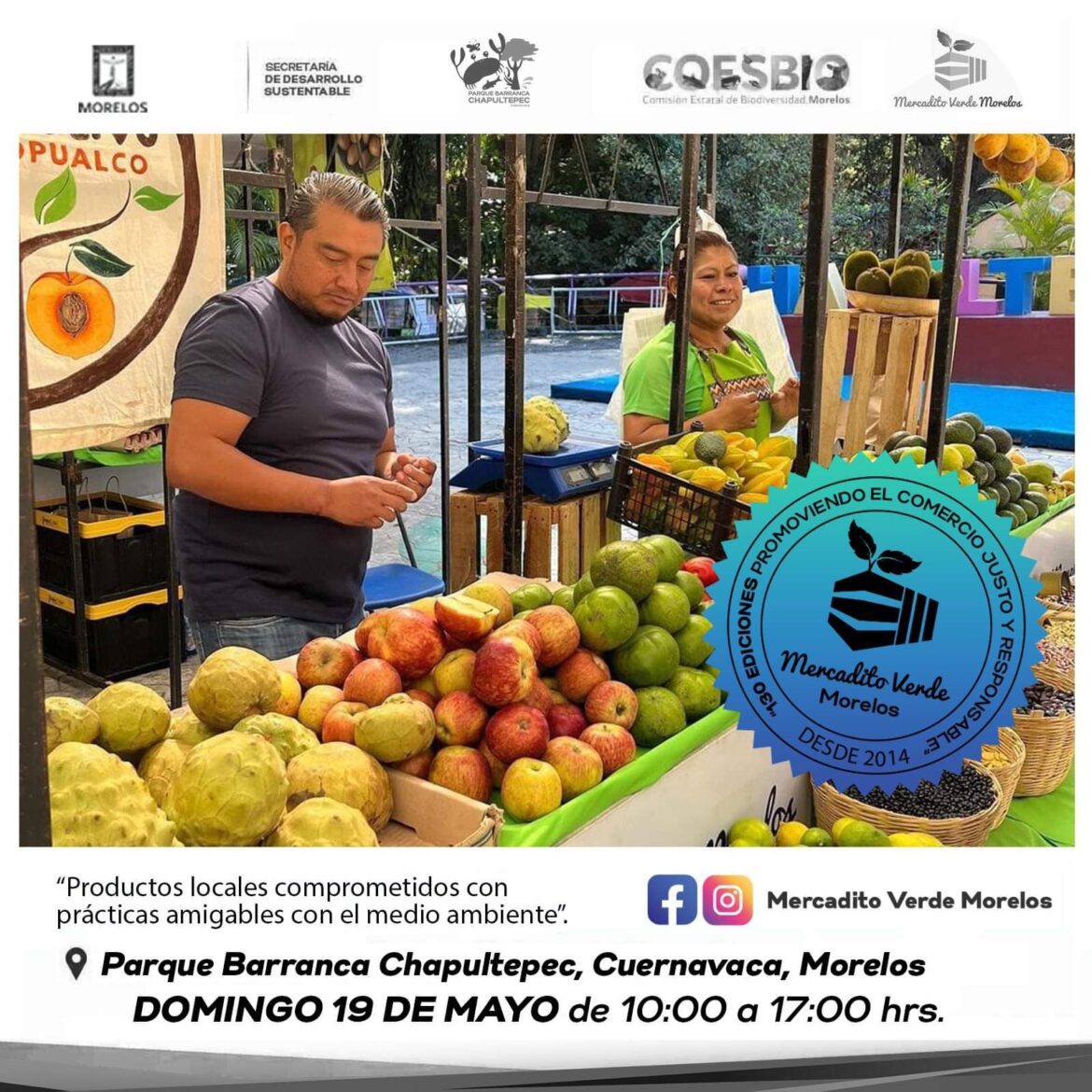 La Secretaría de Desarrollo Sustentable (SDS), a través de la Comisión Estatal de Biodiversidad (Coesbio), informó que este domingo 19 de mayo se realizará la edición 130 del Mercadito Verde Morelos (MVM), en el Parque Estatal Urbano Barranca Chapultepec, de Cuernavaca, de 10:00 a 17:00 horas.