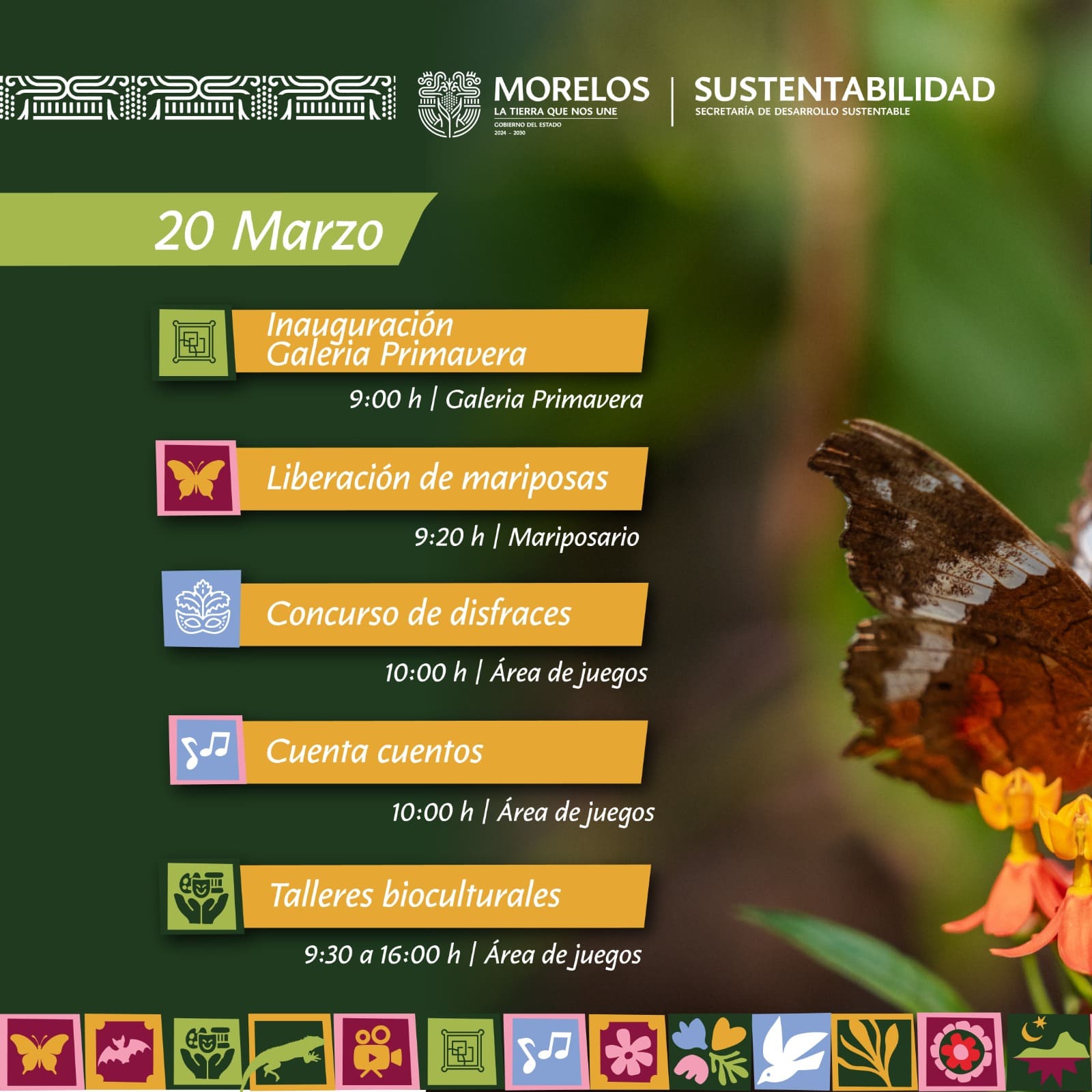 En el marco del Día de la Primavera, la Secretaría de Desarrollo Sustentable del Gobierno del Estado de Morelos invita a la ciudadanía a disfrutar del Festival “Alas de Primavera”, que se llevará a cabo los días 20, 21 y 22 de marzo en el Parque Estatal Urbano Barranca de Chapultepec, un espacio emblemático que hoy se renueva para fortalecer la educación ambiental, la conservación y la convivencia familiar.