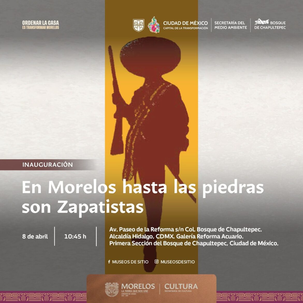 La Secretaría de Cultura del Estado, a través de la Dirección General de Museos y Exposiciones, invita al público general a la inauguración de la exposición «En Morelos hasta las piedras son zapatistas», un homenaje al general Emiliano Zapata Salazar por el 107 aniversario de su muerte.