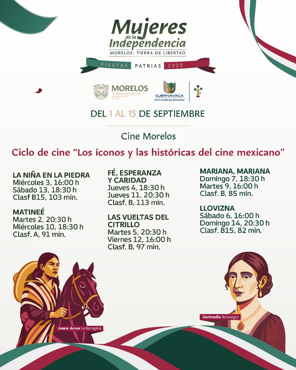 Al respecto, Montserrat Orellana Colmenares, secretaria de Cultura de Morelos, señaló: “Celebrar nuestras fiestas patrias con cine mexicano es una forma de fortalecer la identidad y reconocer el legado artístico de nuestro país. El Cine Morelos es un espacio abierto a la comunidad y en esta ocasión nos invita a reunirnos en torno a la pantalla grande para compartir historias que forman parte de nuestra cultura”.