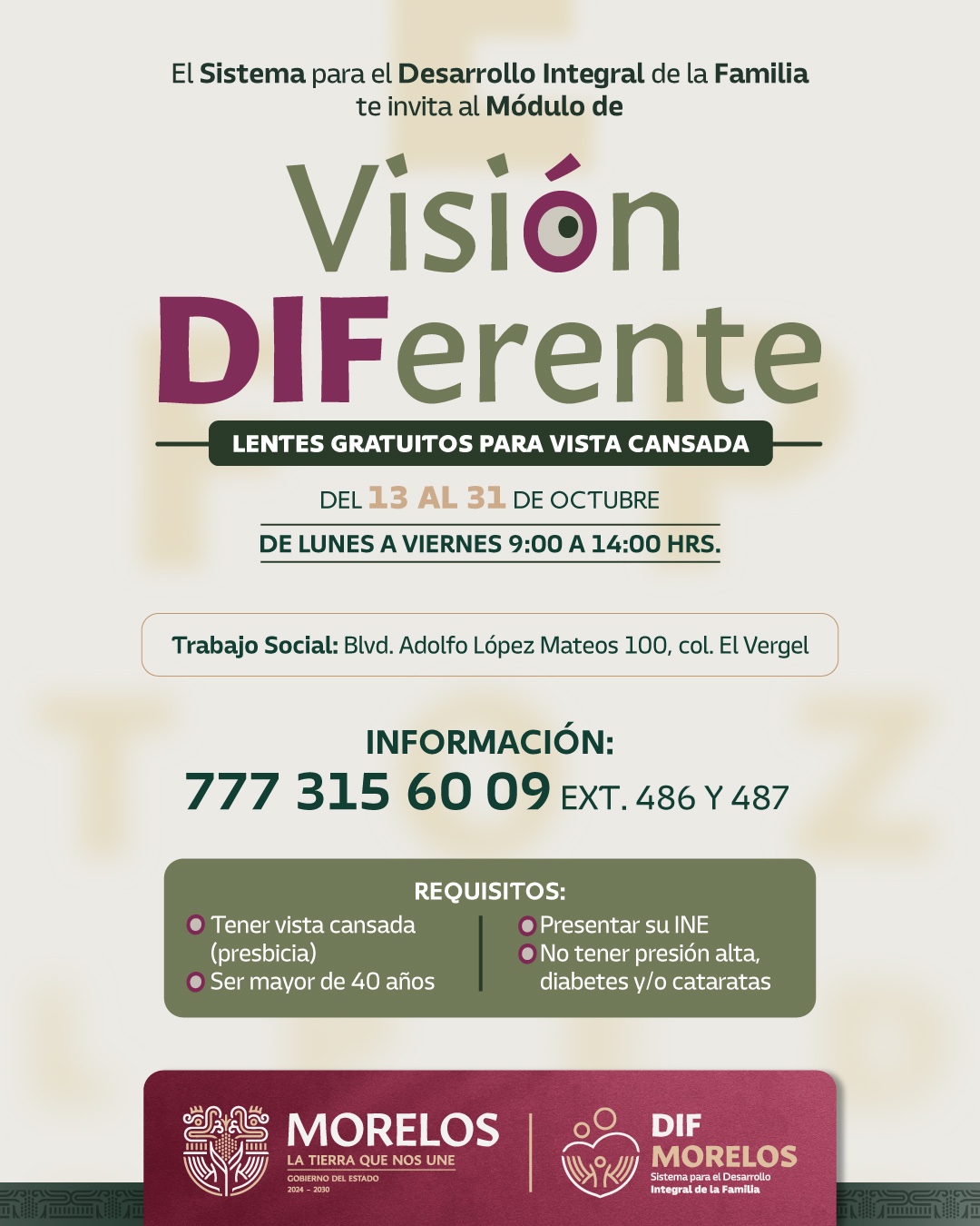 A partir del lunes 13 de octubre y hasta el 31 del mismo mes se contará con un módulo de atención en el área de Trabajo Social del SEDIF ubicada en boulevard Adolfo López Mateos 100, colonia el Vergel, en el municipio de Cuernavaca de lunes a viernes de 09:00 a 14:00 horas. Los requisitos son: padecer de vista cansada, ser mayor de 40 años de edad, no padecer de presión alta, diabetes y/o cataratas, y presentar su identificación oficial vigente.