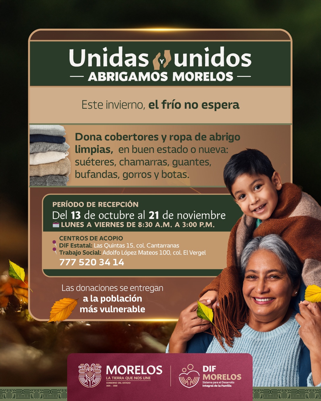Con el propósito de brindar abrigo y esperanza a quienes más lo necesitan, el Sistema para el Desarrollo Integral de la Familia del Estado de Morelos (SEDIF) lanzó la campaña “Unidas y unidos Abrigamos Morelos”, para recaudar cobijas y prendas para frío en apoyo a la población en situación de vulnerabilidad, durante la próxima temporada invernal.