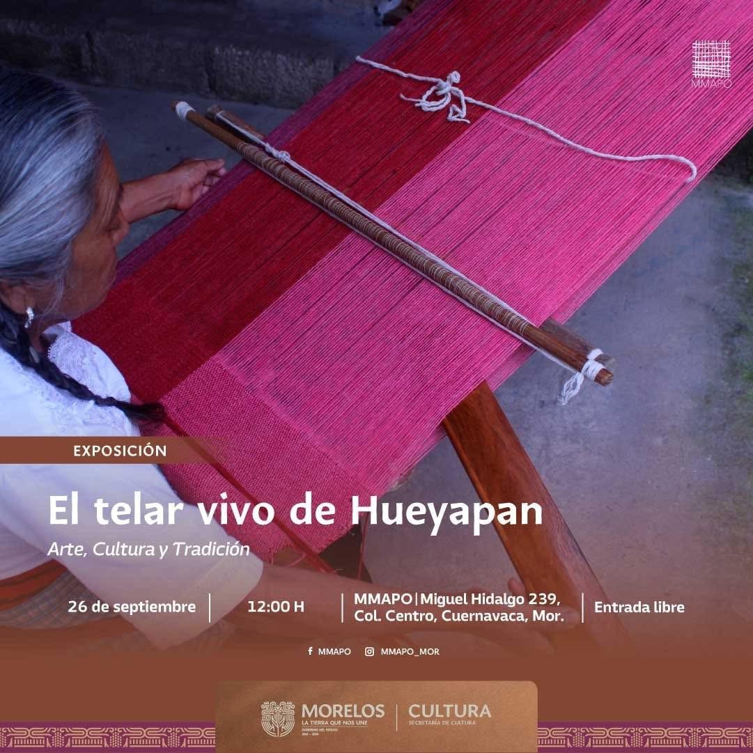 El Gobierno de Morelos, a través de la Secretaría de Cultura, invita a la inauguración de la exposición temporal “El telar vivo de Hueyapan, Arte, Cultura y Tradición”, que se llevará a cabo el viernes 26 de septiembre a las 12:30 horas en la Sala Guillermo Helbling Petrini del Museo Morelense de Arte Popular (MMAPO).