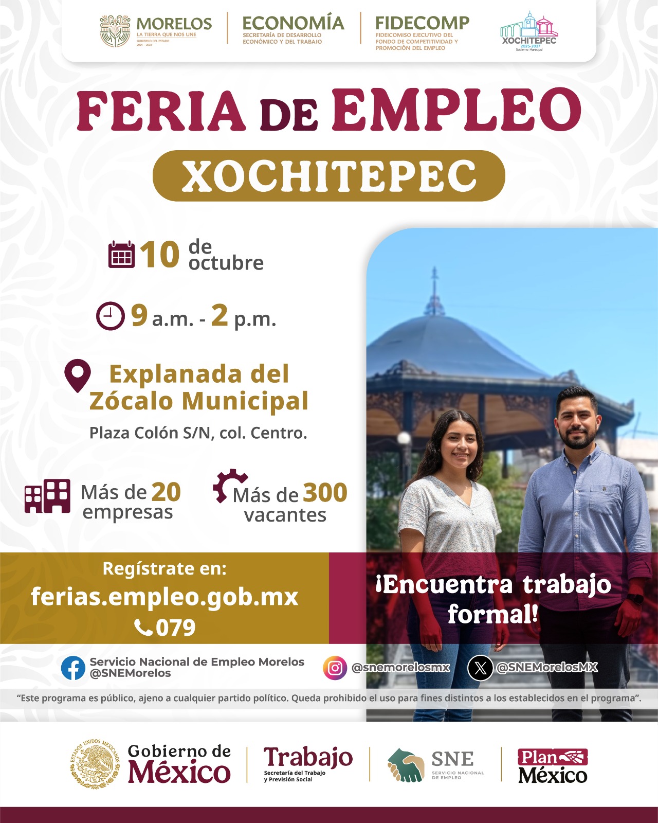 • El evento, en el que se ofrecerán 300 vacantes, se realizará este viernes 10 de octubre, de 9:00 a 14:00 horas en explanada del zócalo municipal.