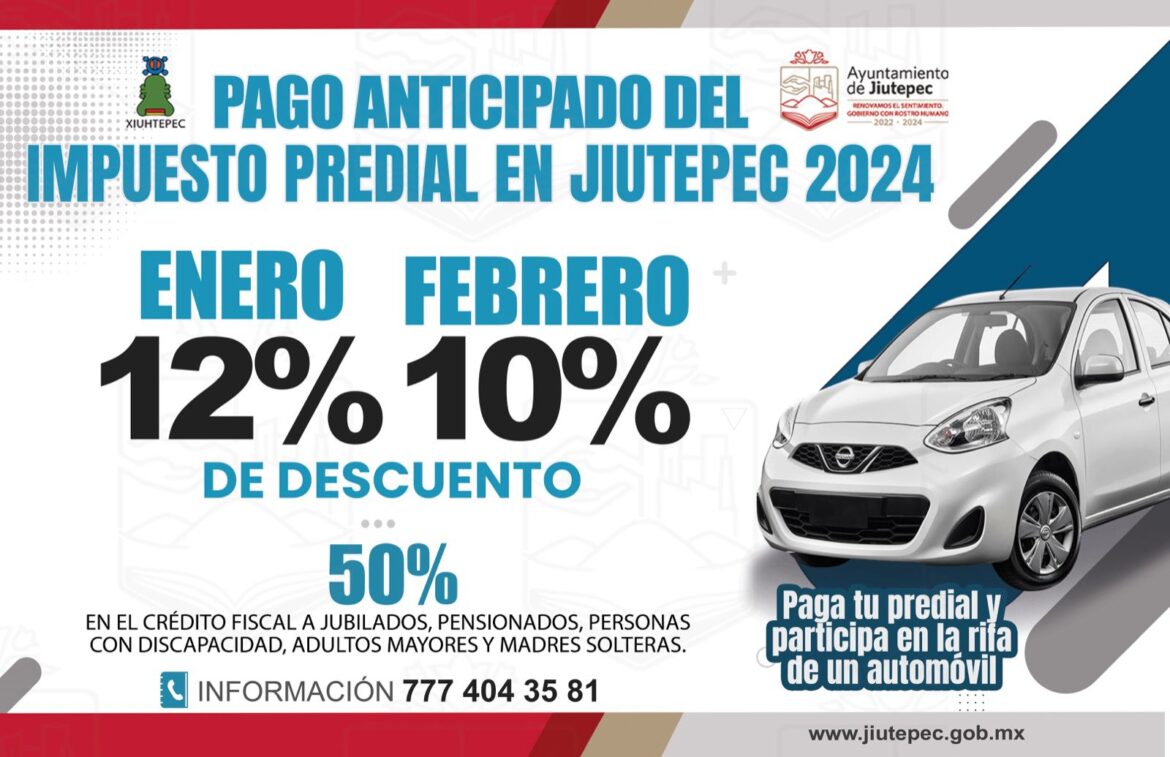 Por acuerdo de los integrantes del Ayuntamiento y para contribuir a la economía de las familias de Jiutepec, el gobierno encabezado por el alcalde Rafael Reyes amplía la campaña de descuento en el cobro del impuesto predial del año 2024; en el mes de enero se aplicará un 12% de descuento y en febrero 10%.