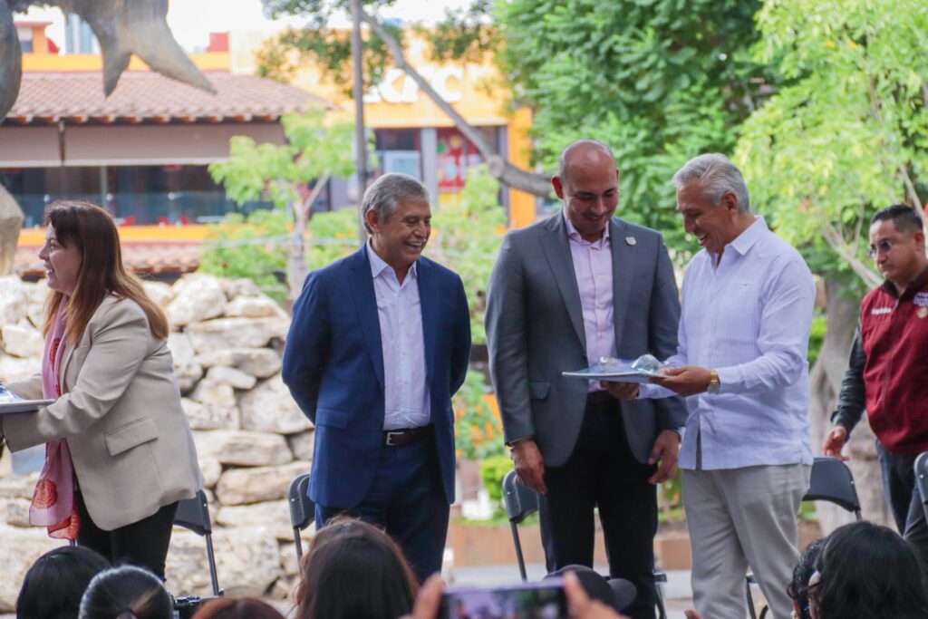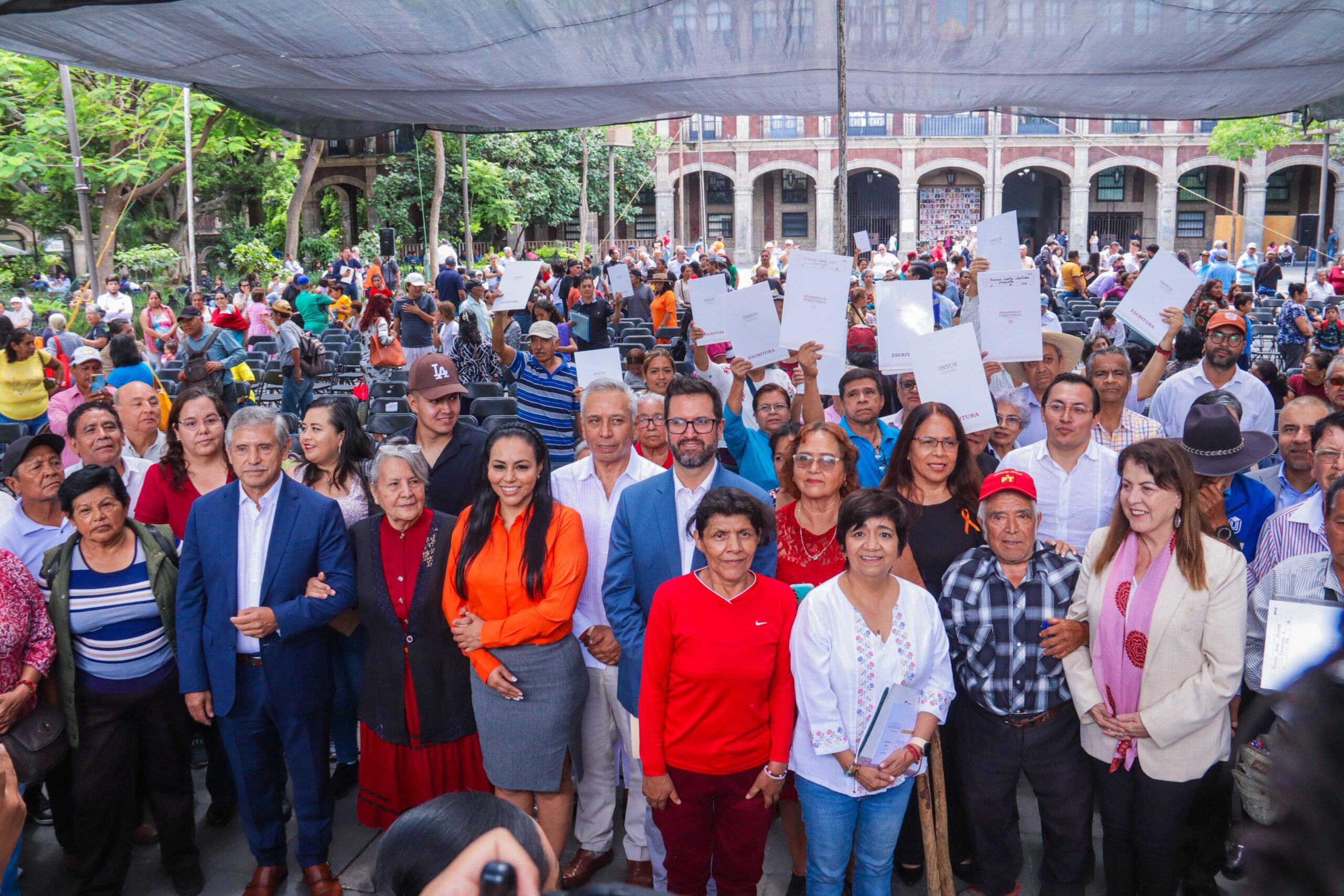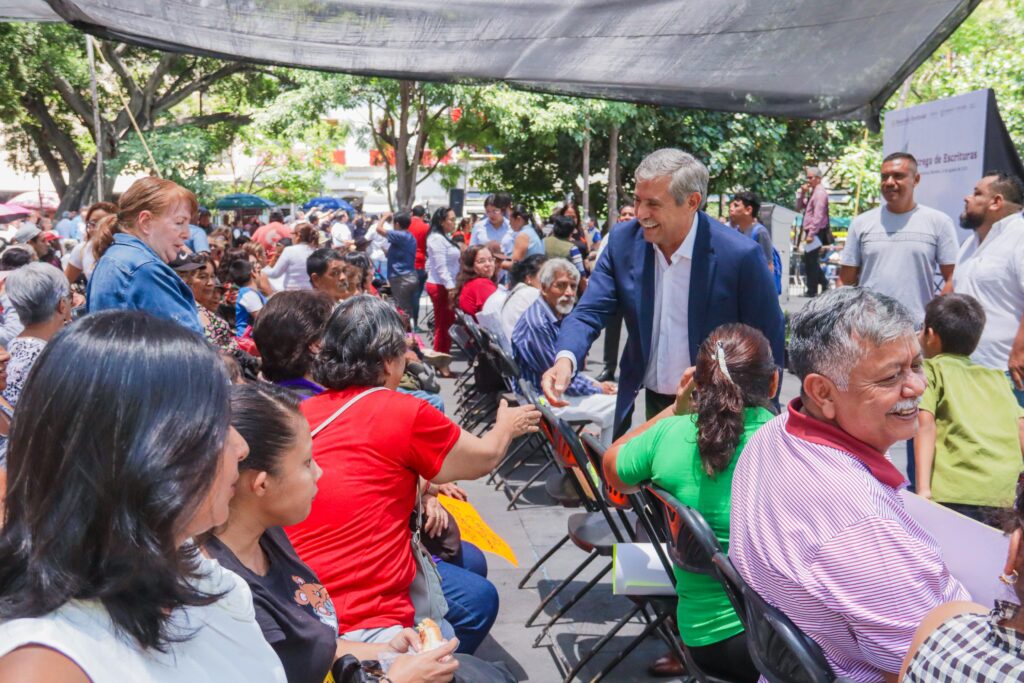 En Plaza de Armas «General Emiliano Zapata Salazar”, Urióstegui Salgado acompañó a la gobernadora Margarita González Saravia y a la secretaria de Desarrollo Agrario, Territorial y Urbano (SEDATU), Edna Elena Vega Rangel, en la entrega simbólica de las escrituras públicas, acto que representa el cierre de una deuda histórica con cientos de familias morelenses.