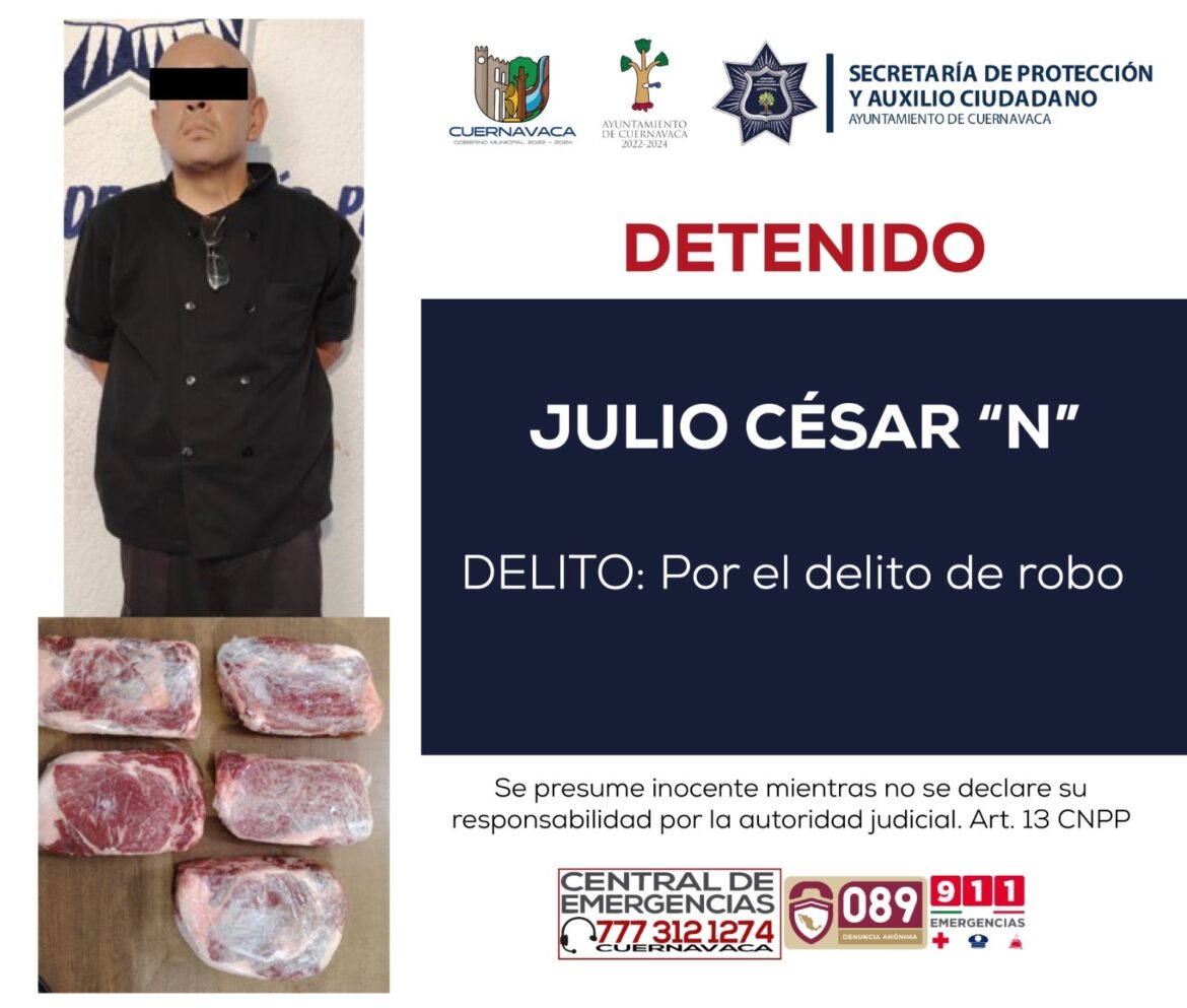 Dentro de estas acciones relevantes, el 07 de junio en la colonia Reforma se detuvo y se puso a disposición del Ministerio Público a Julio César “N” por su probable participación en el delito de robo en agravio del establecimiento “Restaurante Emilia”, se le aseguraron cinco paquetes de carne.