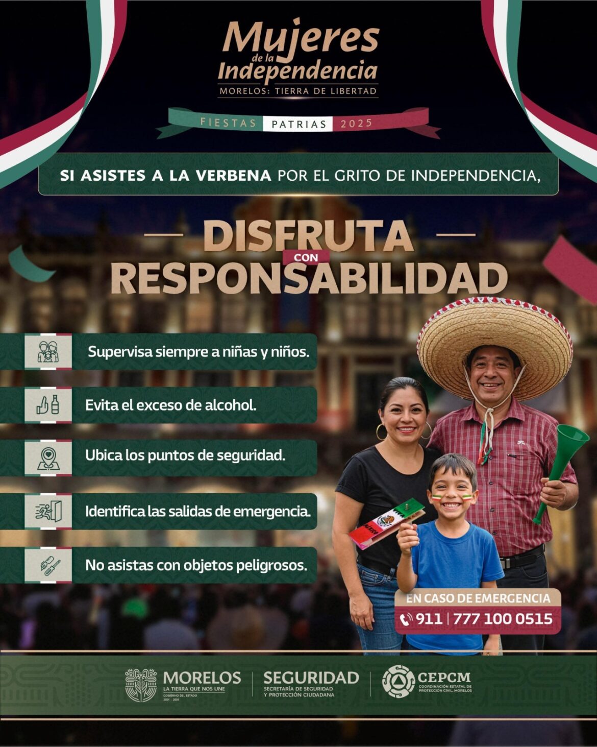 La Coordinación Estatal de Protección Civil Morelos (CEPCM) hizo un exhorto a la ciudadanía a conmemorar las fiestas patrias de manera responsable, privilegiando siempre la seguridad, ya que en estas fechas es fundamental mantener una disposición preventiva para reducir riesgos y evitar accidentes que pongan en peligro la integridad de las personas.