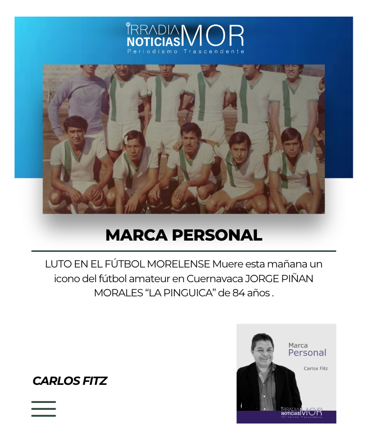 LUTO EN EL FÚTBOL MORELENSE Muere esta mañana un icono del fútbol amateur en Cuernavaca JORGE PIÑAN MORALES “LA PINGUICA” de 84 años un Hombre que dedicó gran parte de su vida a fomentar el fútbol en base a disciplina entrenando todas las mañanas a las 6:30 AM en las instalaciones del IMSS de plan de Ayala Los Pajaros Madrugadores por amor al deporte lograba reunir a muchos jugadores que les fascinaba la forma de dirigir los entrenamientos siempre con pasión y cabulas con jiribilla Que arrancaban las carcajadas de los presentes largas pláticas y duros entrenamientos . Más de 40 años con esa ardua labor descanse en Paz Jorge Piñan Morales “La PINGUICA ”