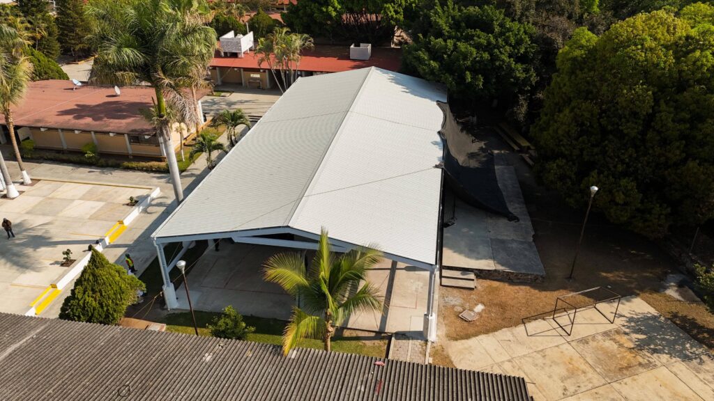 La techumbre metálica tiene una extensión de 450 metros cuadrados y es sostenida por columnas de acero debidamente cimentadas; fue construida por la Secretaría de Infraestructura con una inversión de 2.1 millones de pesos del FISE, fondo mediante el cual se realizan obras y acciones para atender necesidades en zonas de atención prioritaria, tanto urbanas como rurales.
