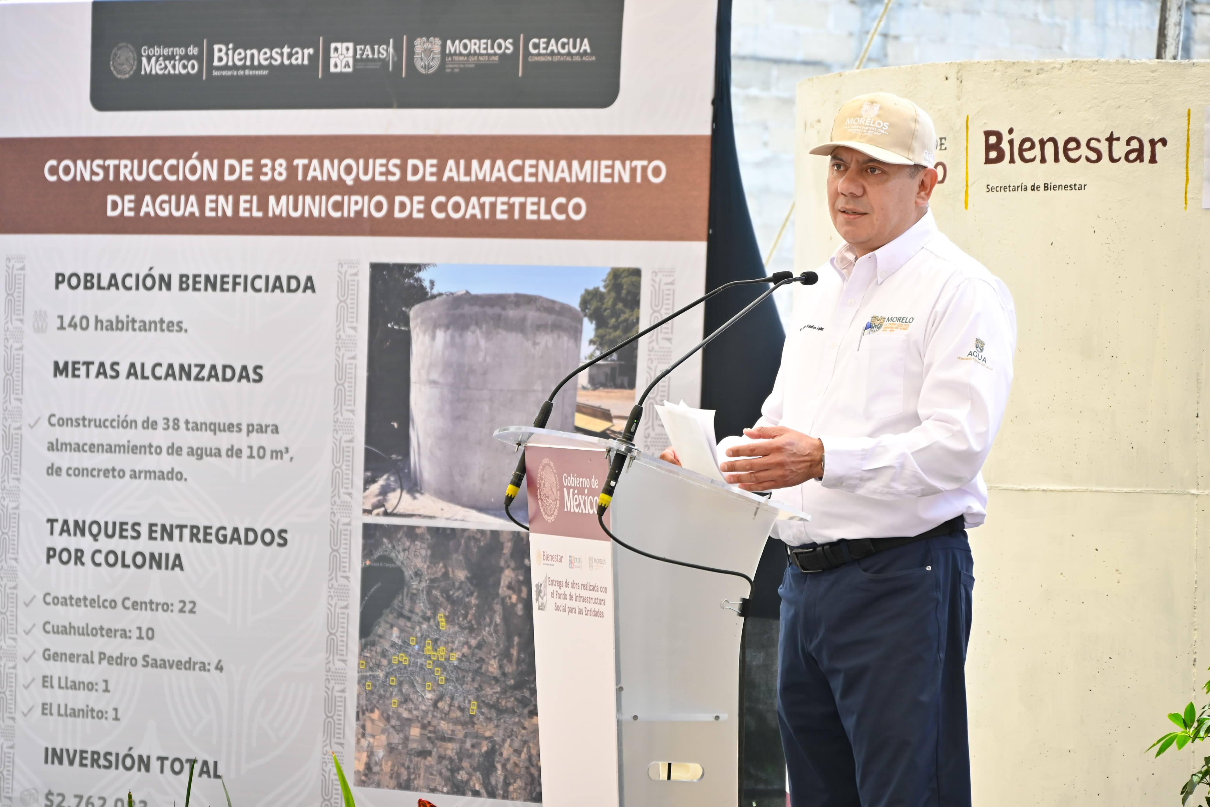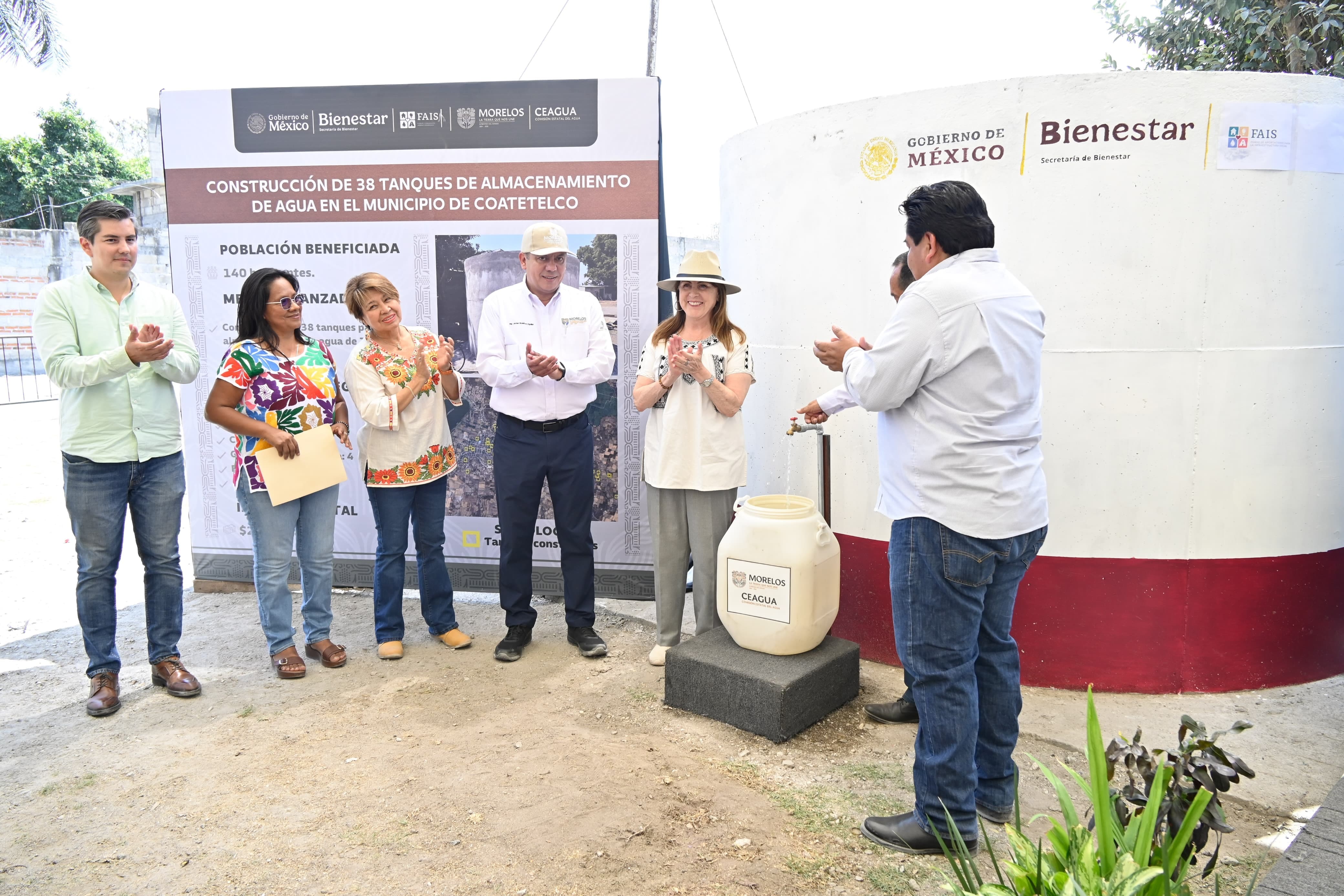 Posteriormente, en el municipio indígena de Coatetelco, Margarita González Saravia entregó 38 tanques de almacenamiento de agua en beneficio de igual número de familias de las colonias Centro, Cuahulotera, General Pedro Saavedra, El Llano y El Llanito.