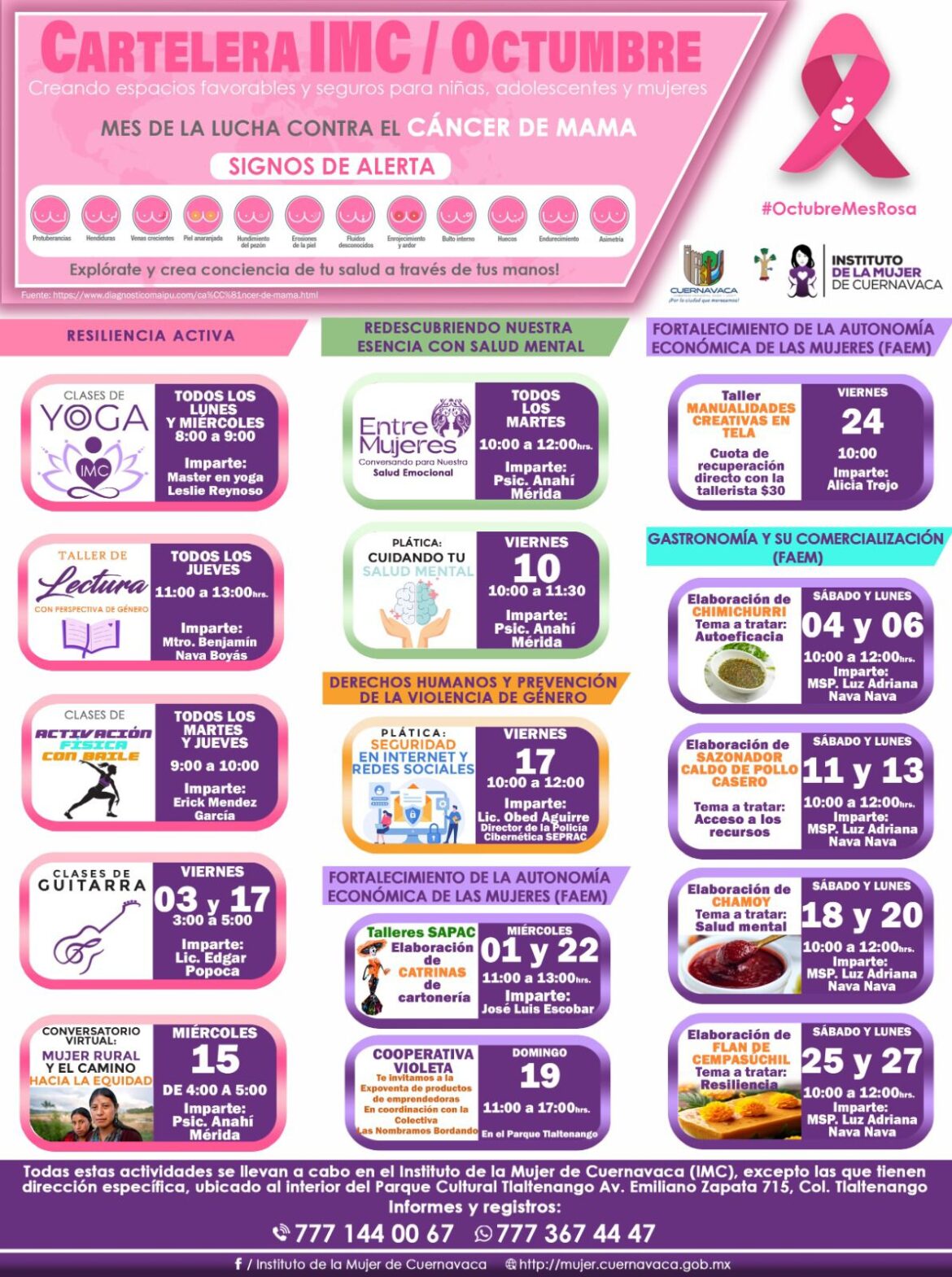 Así lo informó la directora del IMC, Lorena Elizabeth Castillo, y agregó que ya está a disposición de la población del municipio la Cartelera de Octubre, la cual incluye, además de las ya mencionadas, otras actividades como talleres de lectura, manualidades y emprendimiento, capacitaciones para fortalecer la autonomía económica, la Cooperativa Violeta y la elaboración de productos artesanales.