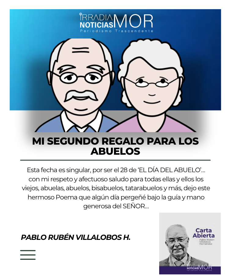 Esta fecha es singular, por ser el 28 de agosto que antes fue denominado ‘Día del Viejo’ y con el paso de los años derivó en ‘EL DÍA DEL ABUELO’… Por esta razón, con mi respeto y afectuoso saludo para todas ellas y ellos los viejos, abuelas, abuelos, bisabuelos, tatarabuelos y más, dejo este hermoso Poema que algún día pergeñé bajo la guía y mano generosa del SEÑOR… Espero que mis amables Lectores lo sigan paso a paso, lo disfruten y lo compartan particularmente con sus adultos mayores de todas las edades entre sexa, septua, octa, nona y centenarios… ¡Feliz Día del Abuelo…! He aquí el regalo con mi Poema: