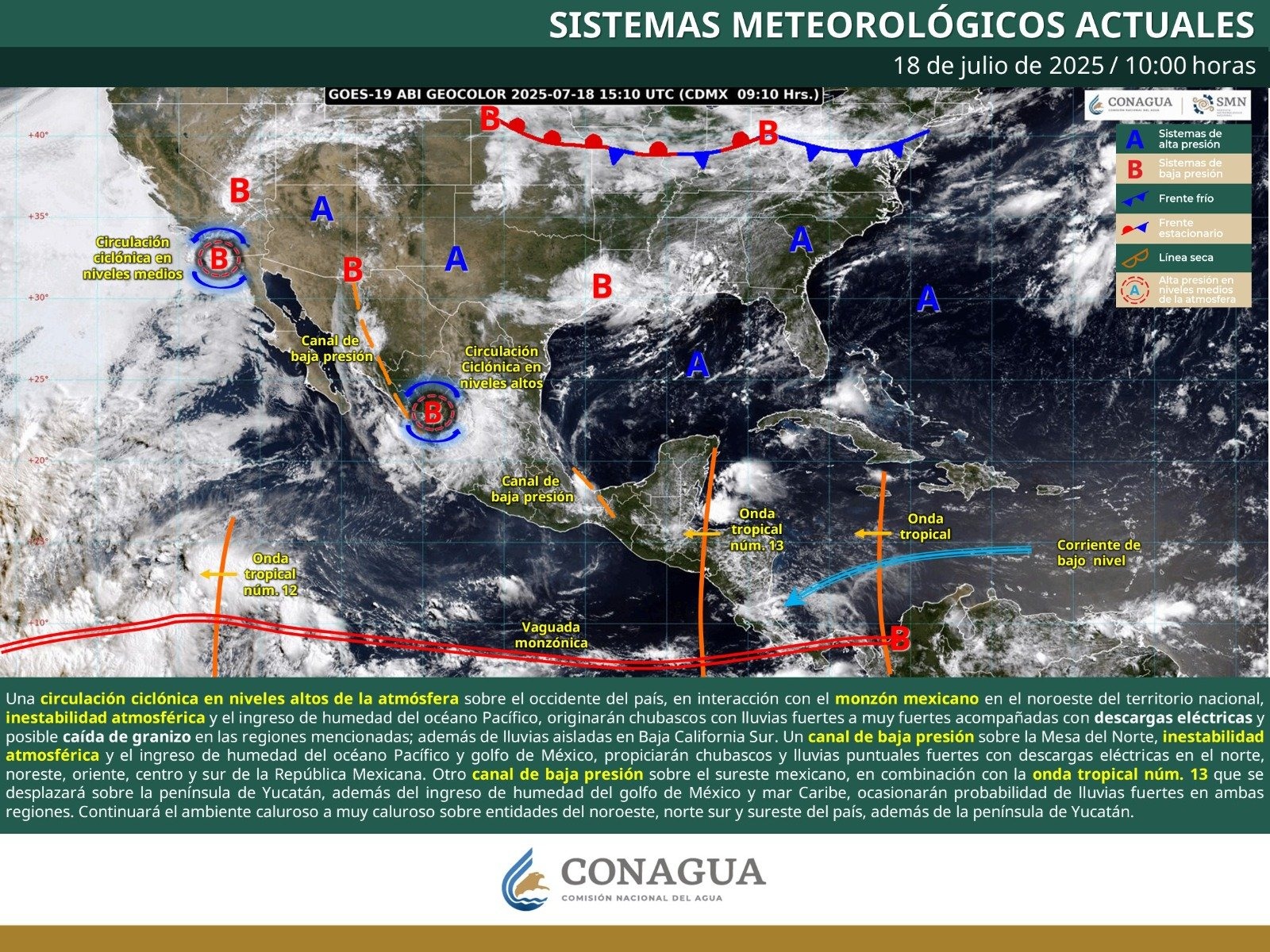 La Comisión Estatal del Agua (Ceagua) da a conocer la perspectiva meteorológica para Morelos durante el fin de semana del 18 al 20 de julio, donde se esperan días con cielo medio despejado durante la mañana y un ambiente fresco en las primeras horas del día, seguido por temperaturas máximas que oscilarán entre los 30 y 35°C, especialmente en municipios del sur de Morelos. Por las tardes y noches, predominarán condiciones para lluvias acompañadas de tormentas eléctricas, producto del ingreso de humedad desde el océano Pacífico y otros sistemas atmosféricos.