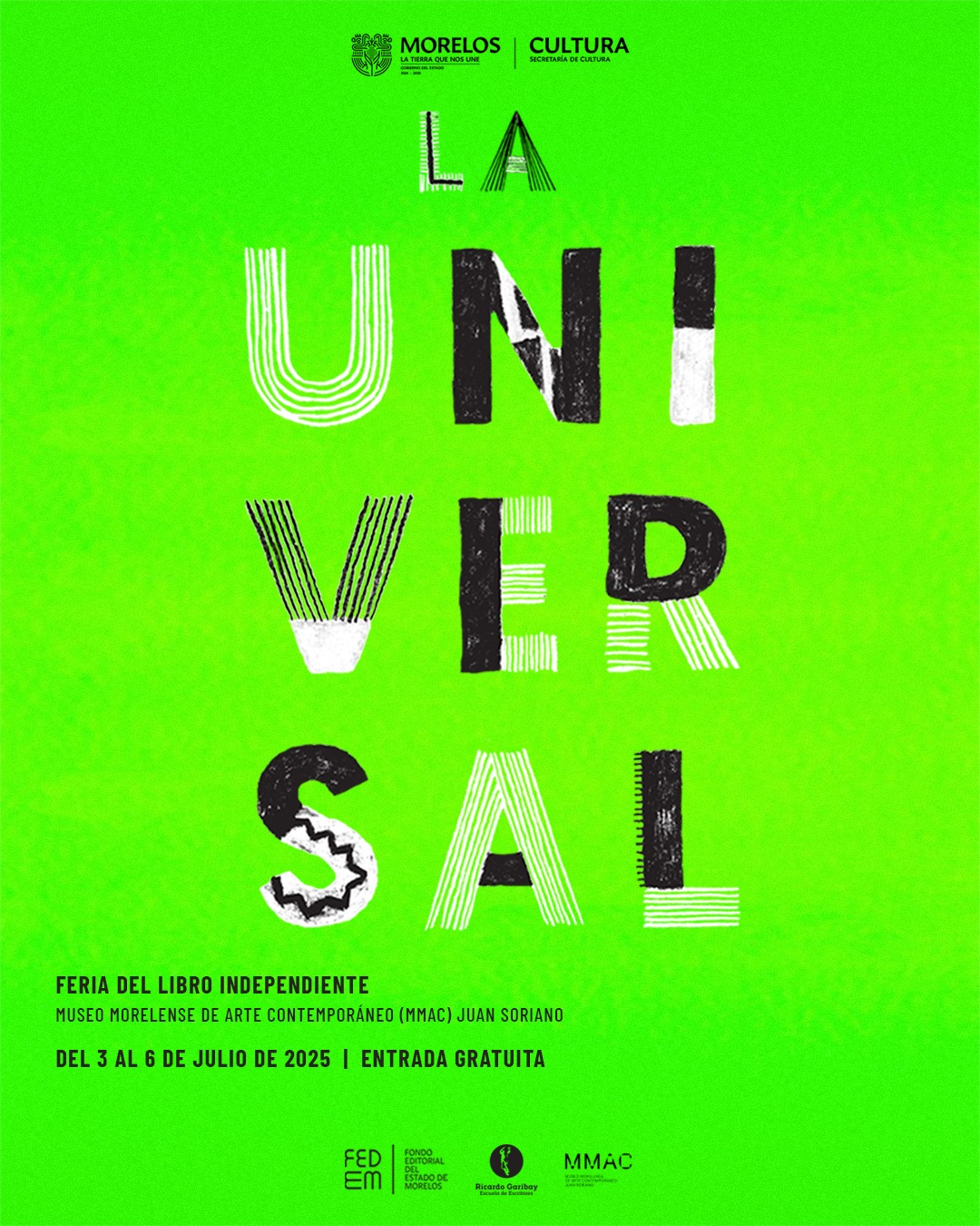 La Secretaría de Cultura del Estado de Morelos, a través de la Dirección de Publicaciones y la Subdirección de Ferias, anunció que la Feria La Universal se celebrará en el Museo Morelense de Arte Contemporáneo (MMAC) Juan Soriano, en Cuernavaca, del 03 al 06 de julio de 2025. Esta feria, dedicada a los libros independientes, contará con la participación de editoriales nacionales e internacionales, ofreciendo una plataforma única para el intercambio cultural y la difusión de voces literarias.