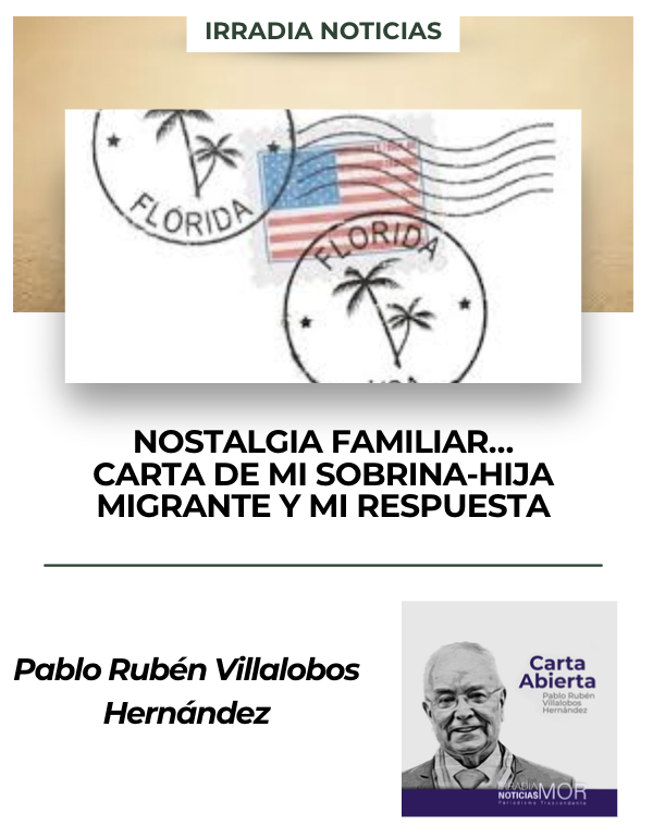 Sorpresivamente recibí el mensaje de mi Sobrina-Hija la Arquitecta Fabiola Villalobos Corona, migrante desde hace más de dos decenas de años, hoy Ciudadana Residente en Miami, Florida a la cual, aúno mi respuesta… “Hola tío muy buenos días, espero que te encuentres muy bien al lado de Lau… Acá está haciendo frío como hace décadas no hacía hasta ha nevado en Naples que está solo a 2 horas de Miami… He tenido que poner la calefacción porque hemos estado a -6 grados, ¿puedes imaginar ese frío en Miami…? Bueno, sólo quise dejarte un saludo por algo que como me dijiste me entró ‘la nostalgia’… Muchas gracias por el acercamiento que hemos tenido estos últimos años, nos hace bien saber que tenemos familia que nos quiere y apoya a los niños en sus actividades que servirá para incentivar su futuro… Esto refuerza nuestra identidad de familia y pertenencia… Te quiero mucho Tío y te tengo en mis oraciones continuamente… ¡Que el Señor Todo Poderoso te cuide a ti, los tuyos y tu casa”! Hasta aquí la grata misiva de mi amada Hija-Sobrina Fabiola Villalobos Corona… Aúno a ella mi afectuosa y cariñosa respuesta que bien sé, muchos de los migrantes y sus familiares también se intercambian… Espero que para algunos sirvan de reflexión e incentivo para hacer lo propio… Dejo aquí la respuesta para mi migrante: “Mi muy amada y querida Hija-Sobrina, ¡Qué gusto me dio leer tu cariñosa misiva que mucho fortalece y enriquece también en mis sentimientos de Tío-Padre-Abuelo…! Los tiempos de heladas que vives y sufres en aquellas latitudes de la Florida estadounidense, yo también las viví y sufrí cuando transité en 1989 por esos senderos hasta Cayo Hueso, pues a nuestro retorno de Orlando, Disney, Cabo Cañaveral y varios espacios de esparcimiento y cultura de esos rumbos y hasta Louisiana por Charleston y Nueva Orleans, hasta llegar a Tucson y Houston, ¡qué nevadas “nos agarraron”!, tanto en las carreteras como en los lugares visitados; en efecto, las temperaturas y nevadas en aquellas fechas fueron bajo cero lo cual nos obligó a buscar los refugios carreteros con calefacción y encontrar un hoteles camineros para el descanso… Cuando llegamos a nuestro ‘México Lindo y Querido’ por rumbos de Matamoros y San Fernando en Tamaulipas para luego llegar a San Luis Potosí pasando por la Sierra Gorda, nos pareció entrar al paraíso… Por lo que verás con este antecedente, entiendo y comprendo tus padecimientos por estas tormentas, heladas y nevadas a más de bajo cero; ten cuidado con el gasto de energía eléctrica por la calefacción, pues allá, ese es otro dolor de cabeza… También entiendo tu nostalgia por estar lejos de tu Patria, de tu Tierra Morelense y de los tuyos por tu permanente lucha para ser y crecer como lo has alcanzado… No te dejes vencer… Sabes que cuántas veces puedas desprenderte de ese tu destino para estar con nosotros, siempre tienes calor de hogares que con gusto y cariño te abrimos las puertas, donde el mayor de los calores es el humano que acá tienes en abundancia por todos los que te amamos, queremos y bien recordamos: Tu Señora Mamá; tu Padre mi Hermano; tus Hermanos, Tíos, Sobrinos, Primos y más, entre los cuales, puedo expresarlo con orgullo estoy como Tío-Padre para dialogar, escucharte, abrazarte y protegerte… Reiteradamente, Te Amo… Abrazo a mi FABIcon ternura, con amor y con cariño… ¡Que el Señor Padre te proteja y te guarde…! ¡Échale ganas…! Por cierto, te mandé el Poema Nostalgia. ¿Lo leíste, razonaste y disfrutaste…? Tu Tío-Padre que te recuerda con cariño y amor, Pablo Rubén”… Hasta aquí las misivas de carácter familiar a las cuales aúno por y para todos aquellos quienes viven en la distancia y caen en la nostalgia, este mi Poema así titulado.