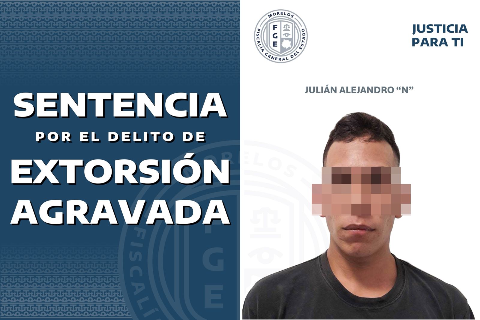 La Fiscalía de Investigación de Delitos de Alto Impacto (FIDAI) obtuvo una sentencia condenatoria de 15 años de prisión en contra de Julián Alejandro “N”, quien fue encontrado penalmente responsable del delito de extorsión agravada, en hechos suscitados en el municipio de Jiutepec.
