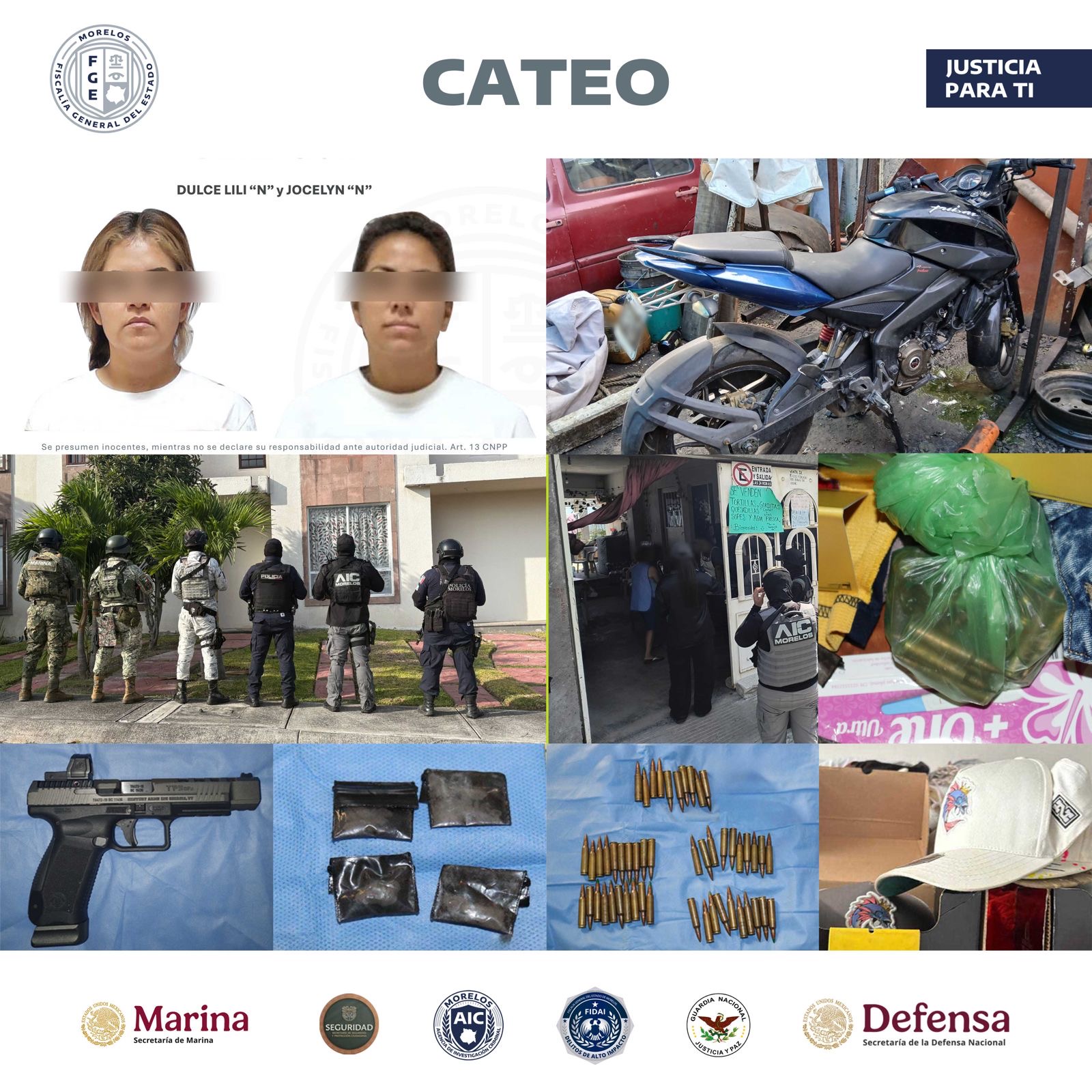 Autoridades estatales y federales de la Mesa de Coordinación Estatal para la Construcción de Paz y Seguridad cumplimentaron un operativo en los municipios de Emiliano Zapata y Xochitepec, en donde aseguraron indicios relacionados con delito contra la salud, un arma, casquillos de diferentes calibres, vehículos y detuvieron a dos mujeres, en ocho inmuebles vinculados con una célula delictiva.